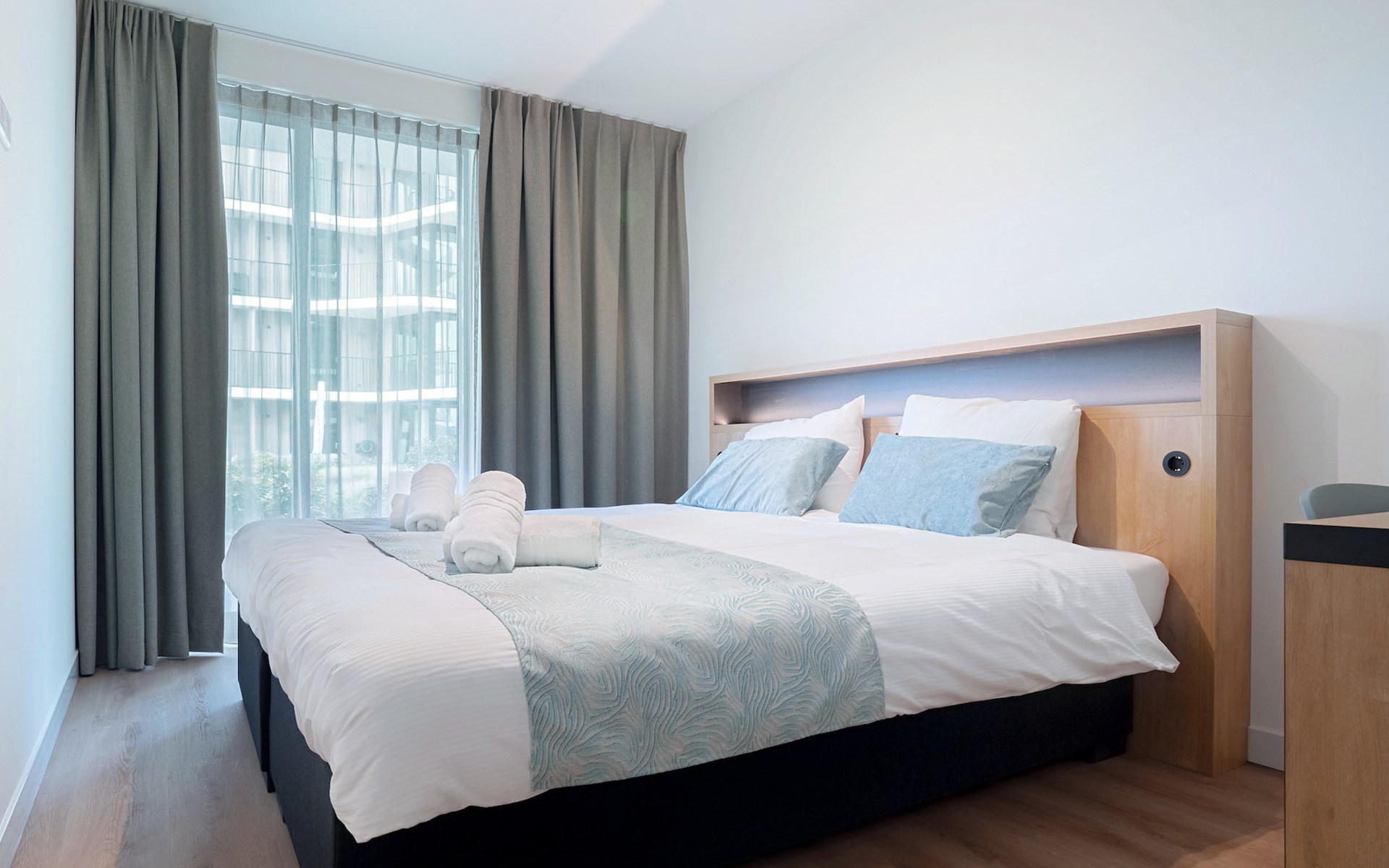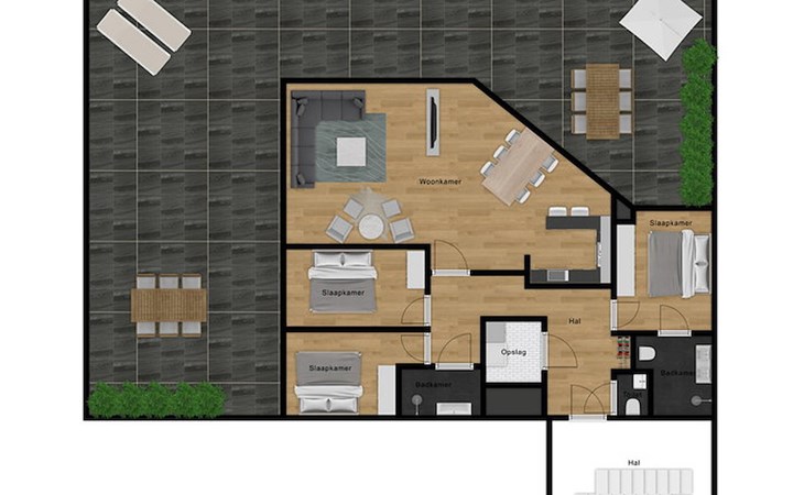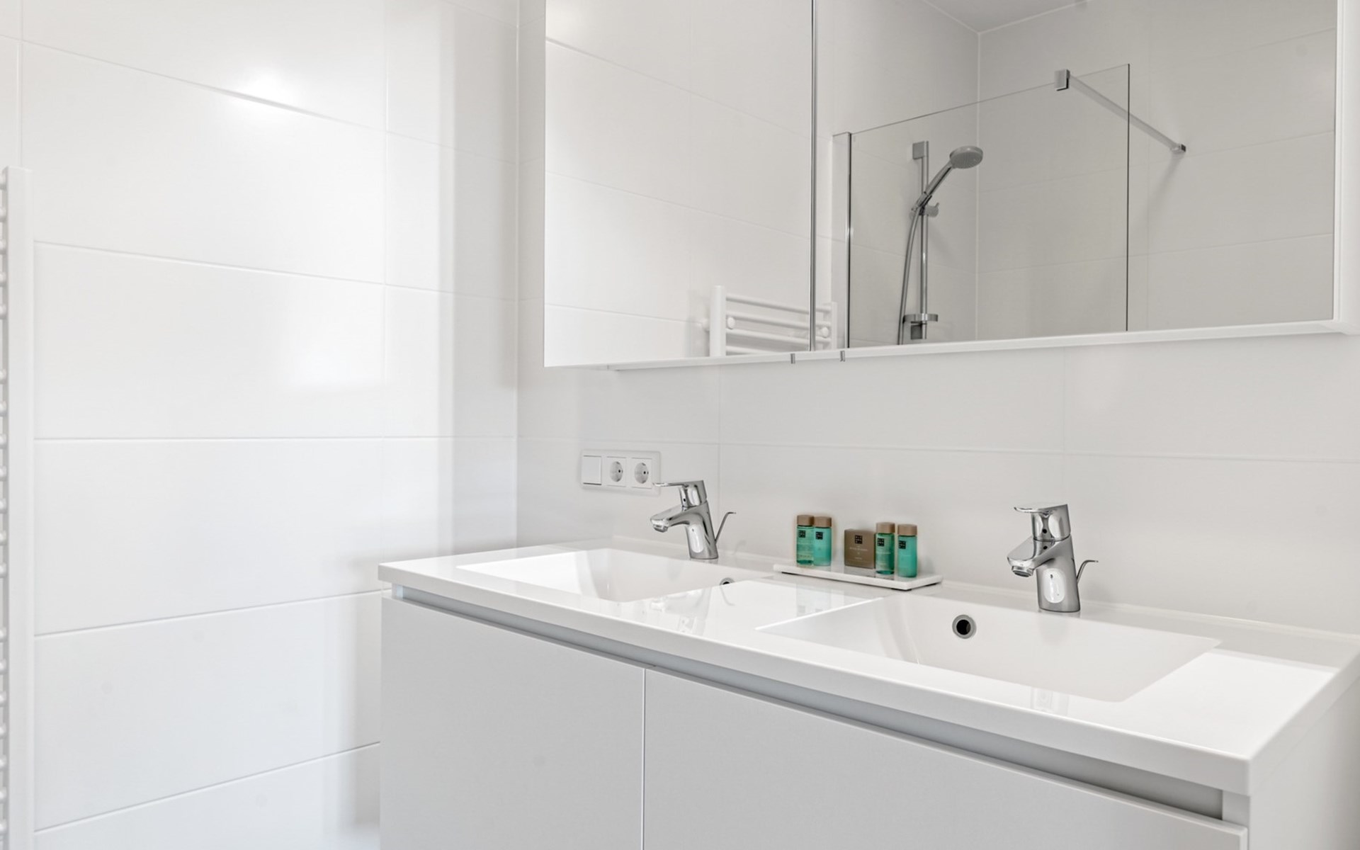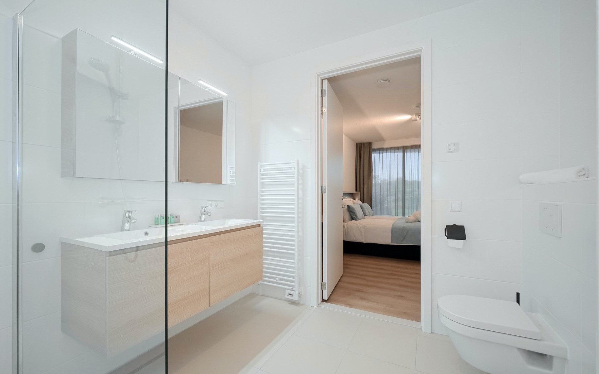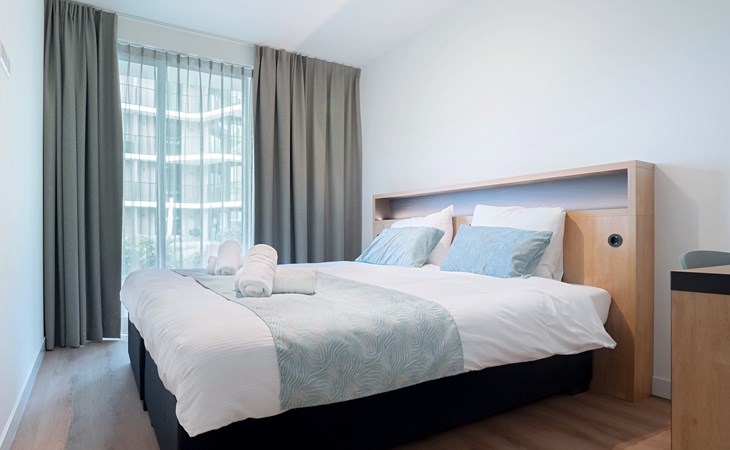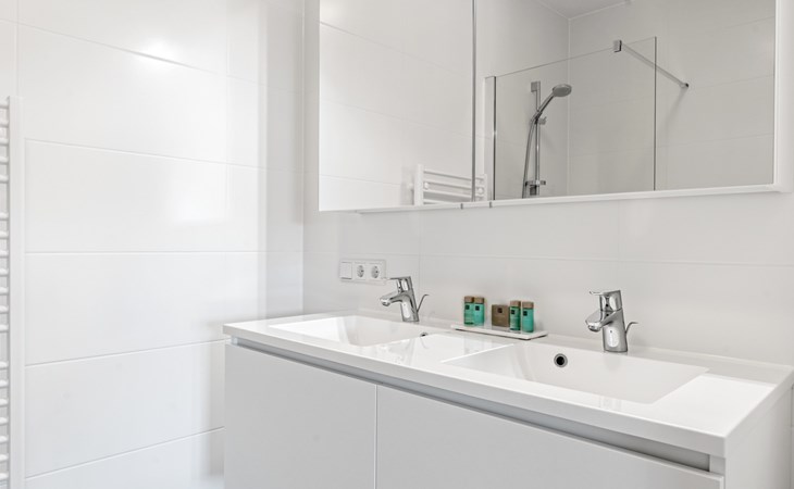 Verder vind je in het appartement 3 slaapkamers met elk een 2-persoonsbed, waarvan één slaapkamer een en-suite badkamer heeft met inloopdouche, dubbele wastafel en toilet. De tweede badkamer is bereikbaar via de hal en beschikt over een inloopdouche en dubbele wastafel. Ook is er een separaat toilet aanwezig.