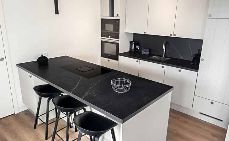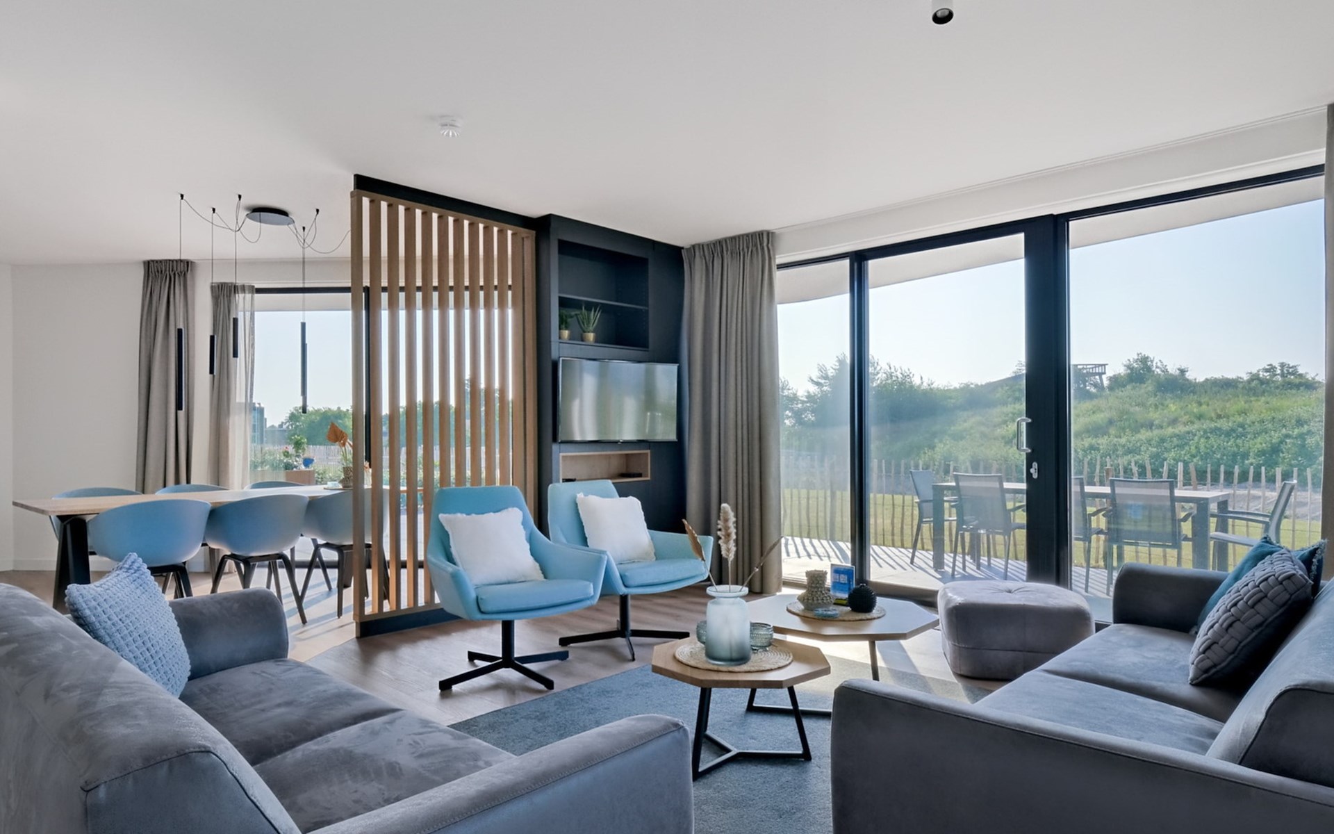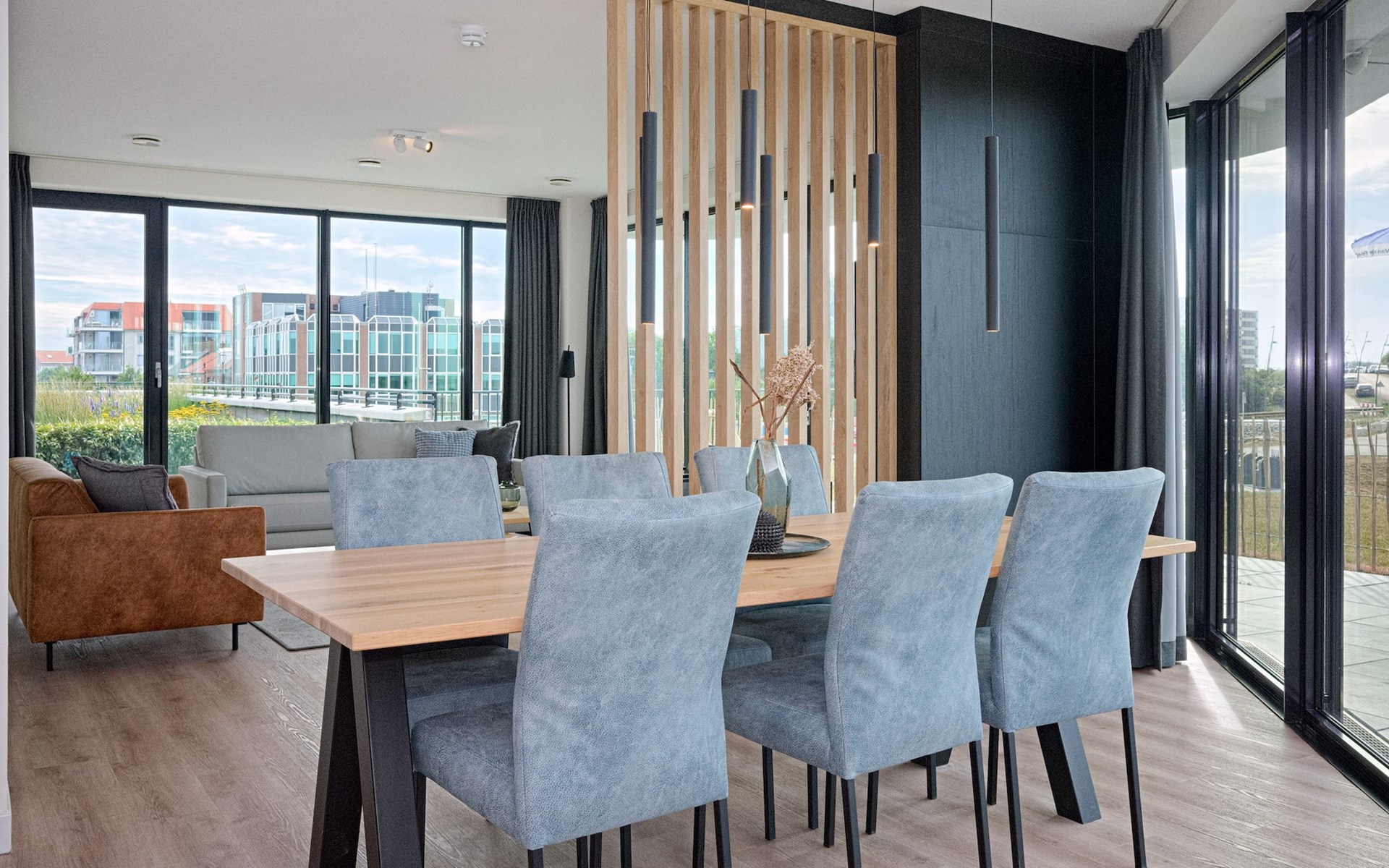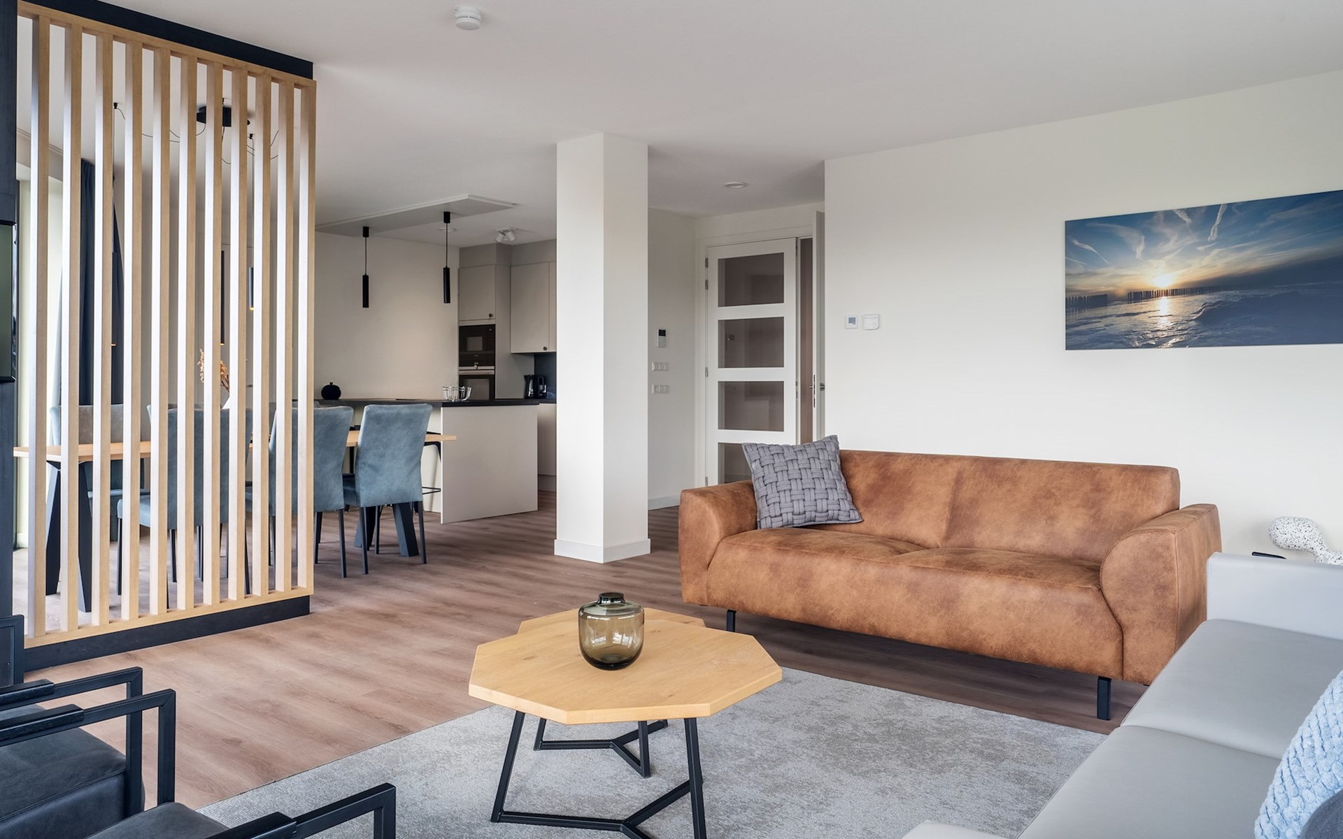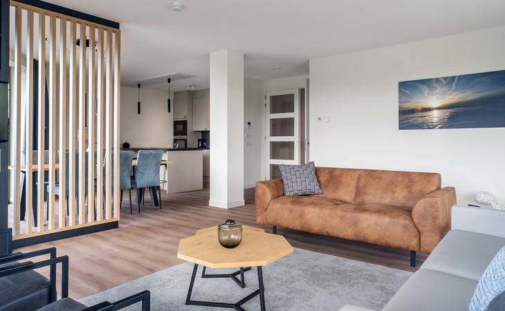 De royale woonkamer is voorzien van een ruime zithoek met een smart-tv met streaming mogelijkheid en een eetgedeelte. De moderne open keuken is compleet uitgerust met onder andere een koelkast, combi-oven, Nespresso apparaat en een vaatwasser.