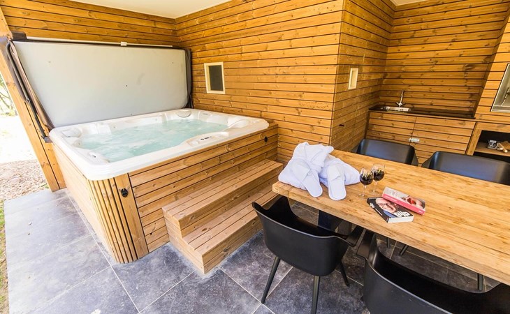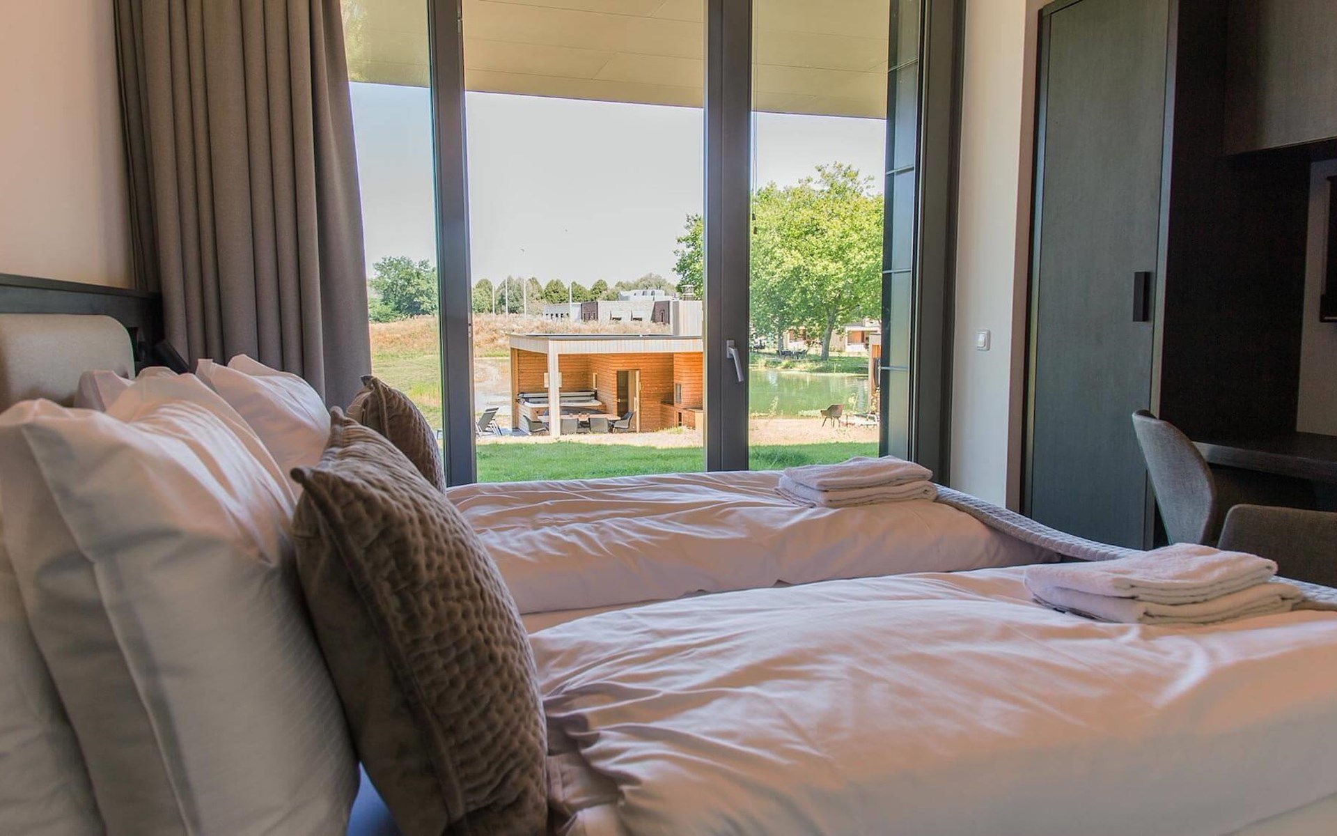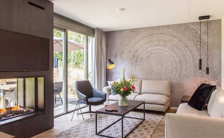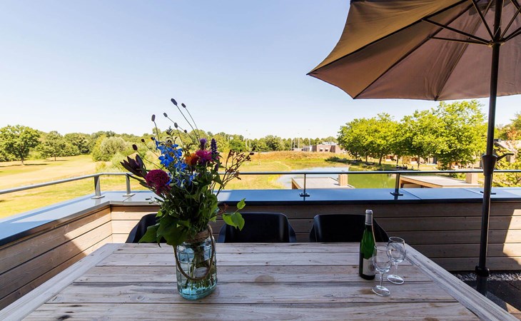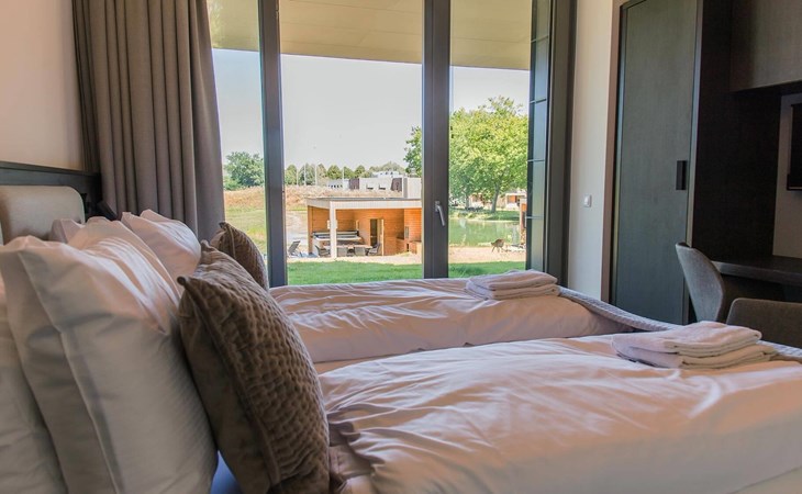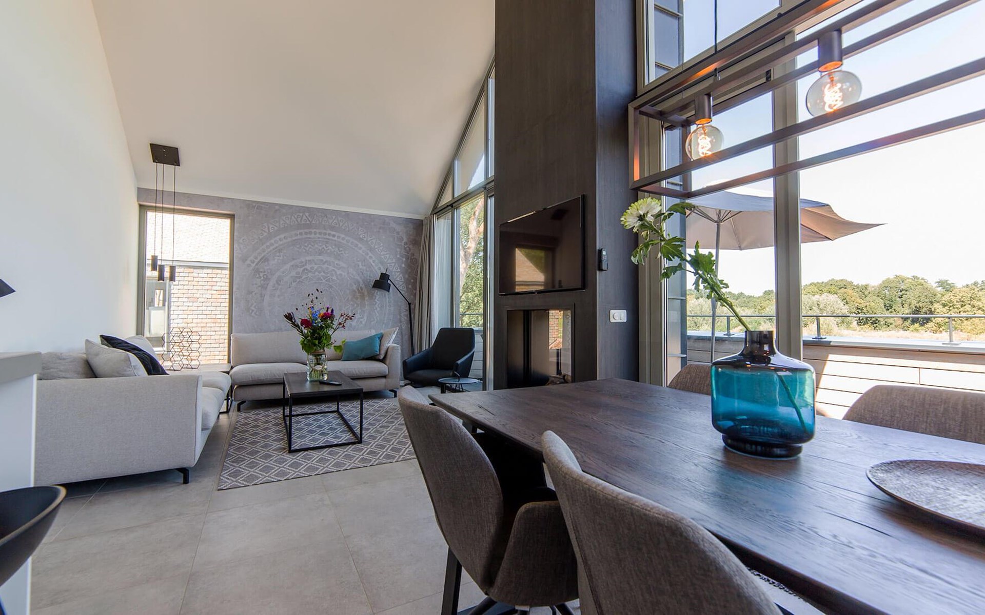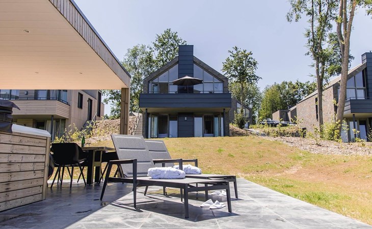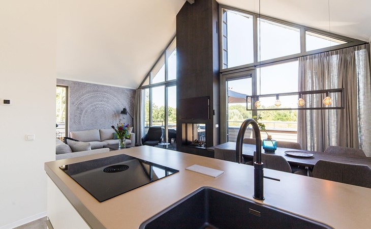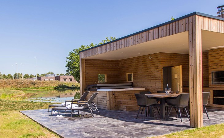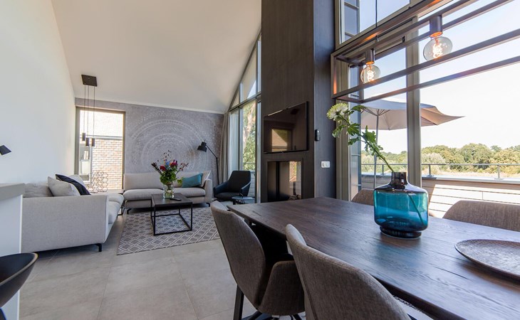 Buiten beschik je over een aangrenzend panoramaterras, een privé buitenwellness, buitenhaard én een buitenkeuken. Met uitzicht op het wonderschone Limburgse landschap en het water kun je hier heerlijk ontspannen!