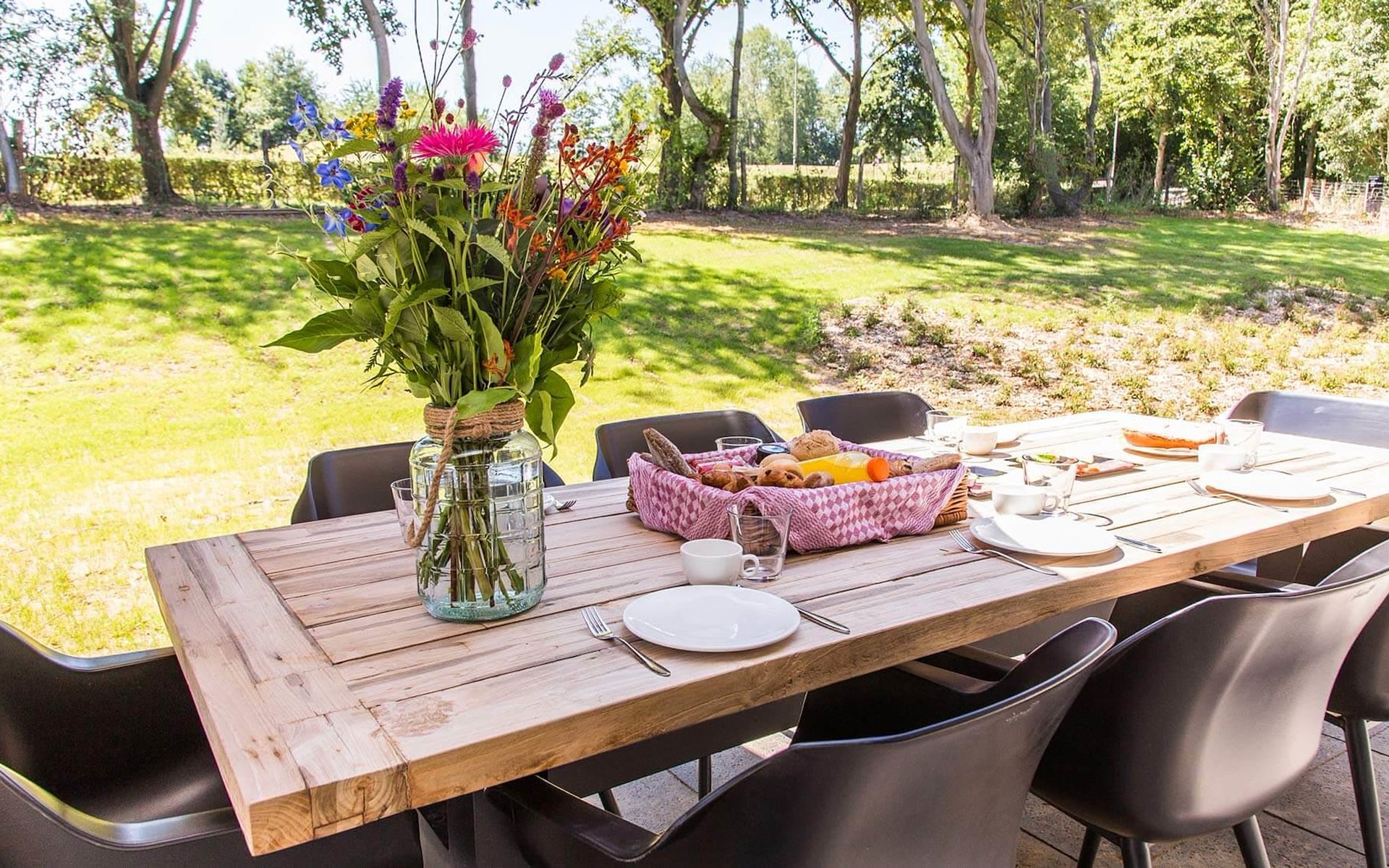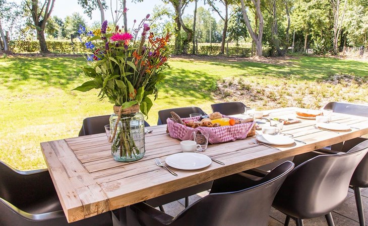 Ook buiten kun je prinsheerlijk genieten! In de tuin is een gemeubileerd terras met sfeervolle buitenhaard. Dit terras bereik je via de openslaande deuren in de woonkamer.