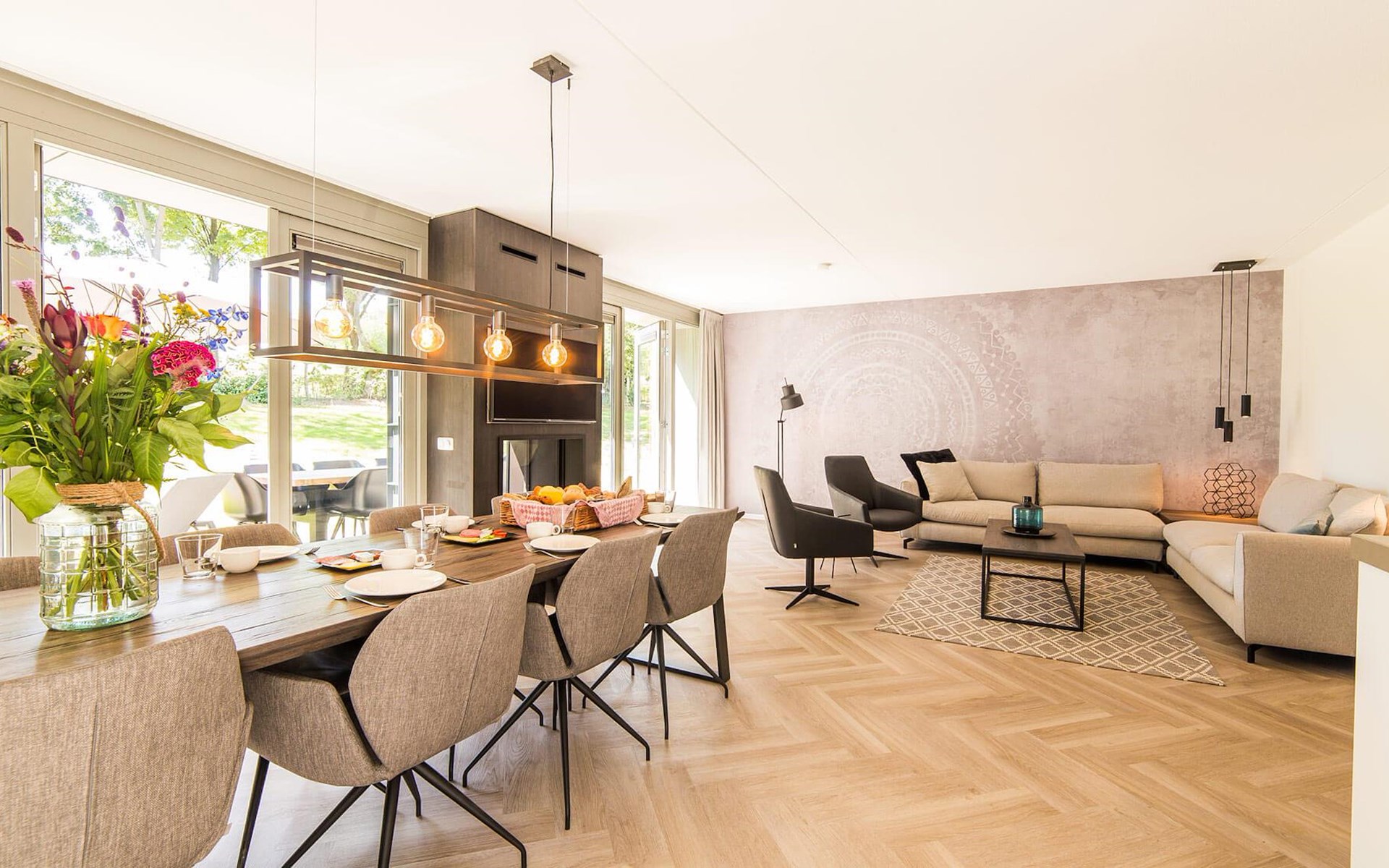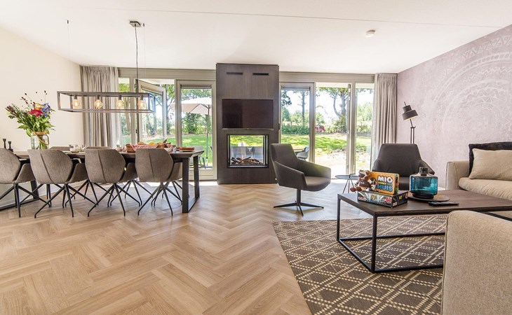 Je verblijft met je gezelschap in een zeer lichte en ruime villa met een royale woonkamer met een ruimte eethoek, comfortabele zithoek met een televisie en een gashaard om te genieten. Je hebt de beschikking over een zeer ruime open keuken met een riant kookeiland en luxe apparatuur waaronder een kokendwaterkraan, combi-oven, vaatwasser en een Nespresso apparaat.