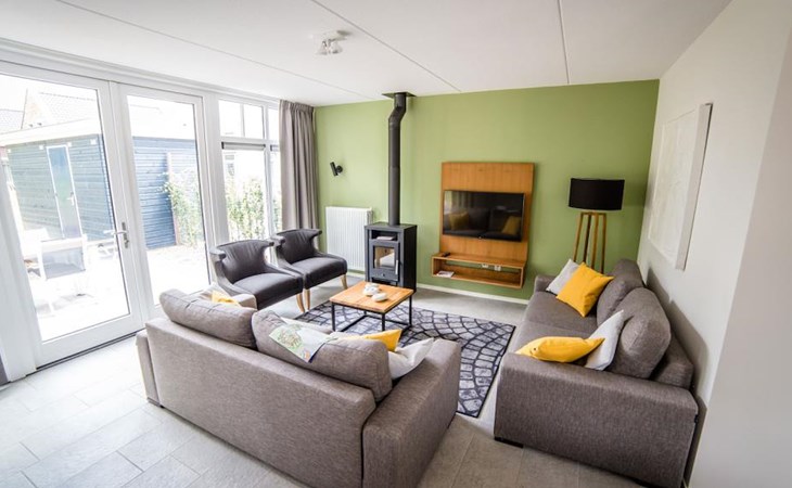 De royale woonkamer is voorzien van een zithoek met sfeervolle vrijstaande houtkachel en televisie. Daarnaast is er een eetgedeelte met eettafel. De luxe keuken is volledig uitgerust met onder andere een Amerikaanse koelkast, combi-oven, vaatwasser, waterkoker, kookplaat, broodrooster en een Nespresso apparaat. Op de begane grond is ook een separaat toilet aanwezig.