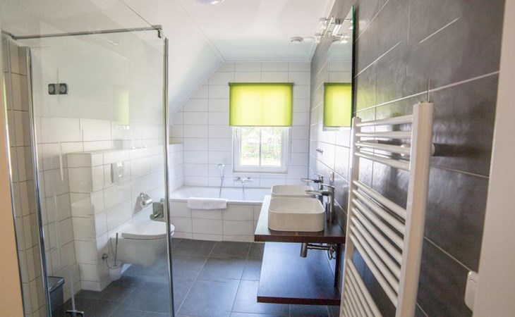De woning beschikt over 4 slaapkamers met 2 éénpersoonsbedden. Op de begane grond vind je een slaapkamer met een badkamer en-suite met een douche en wastafel. Daarnaast is er een separaat toilet aanwezig. Op de eerste verdieping zijn er nog drie slaapkamers en een badkamer met ligbad, douche, dubbele wastafel en toilet.
