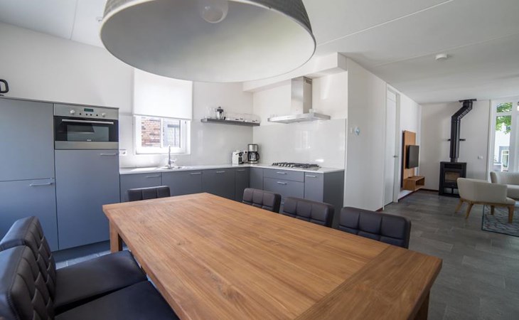 De royale woonkamer is voorzien van zithoek met een vrijstaande houtkachel en een televisie. Openslaande deuren geven je vanuit de woonkamer toegang tot een ruim, gemeubileerd terras met uitzicht op de tuin.