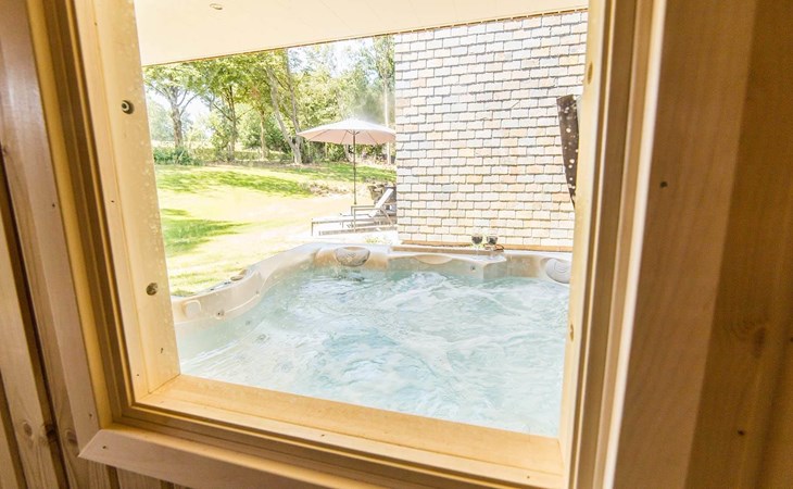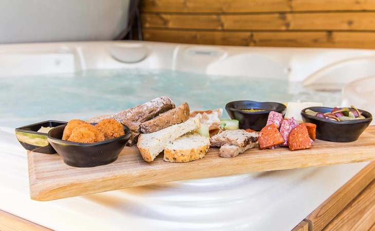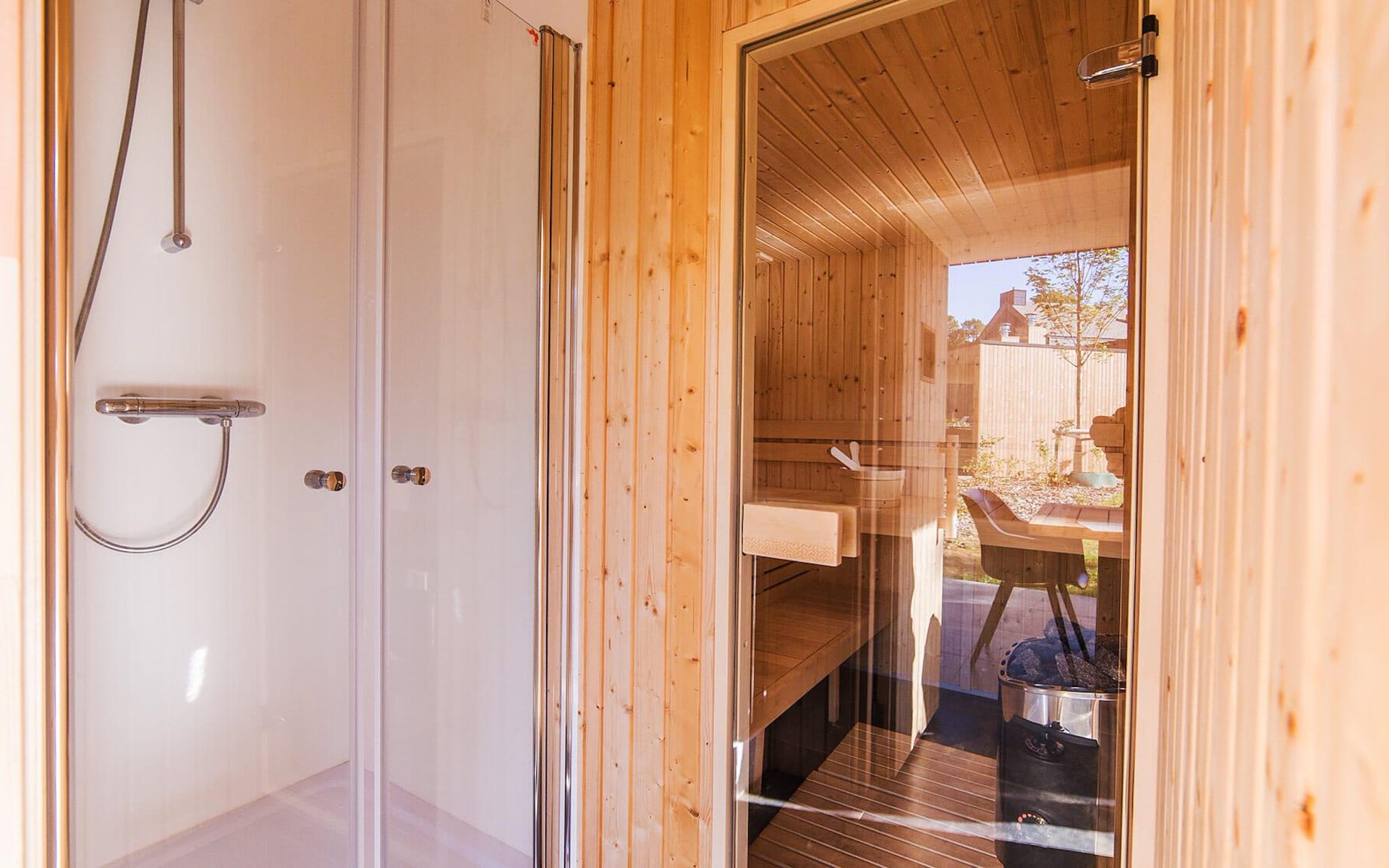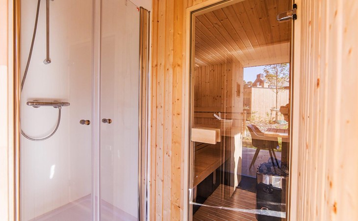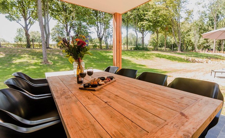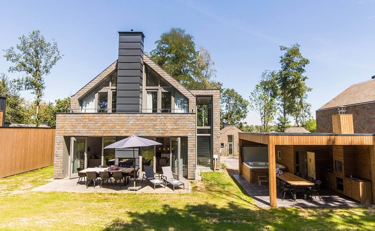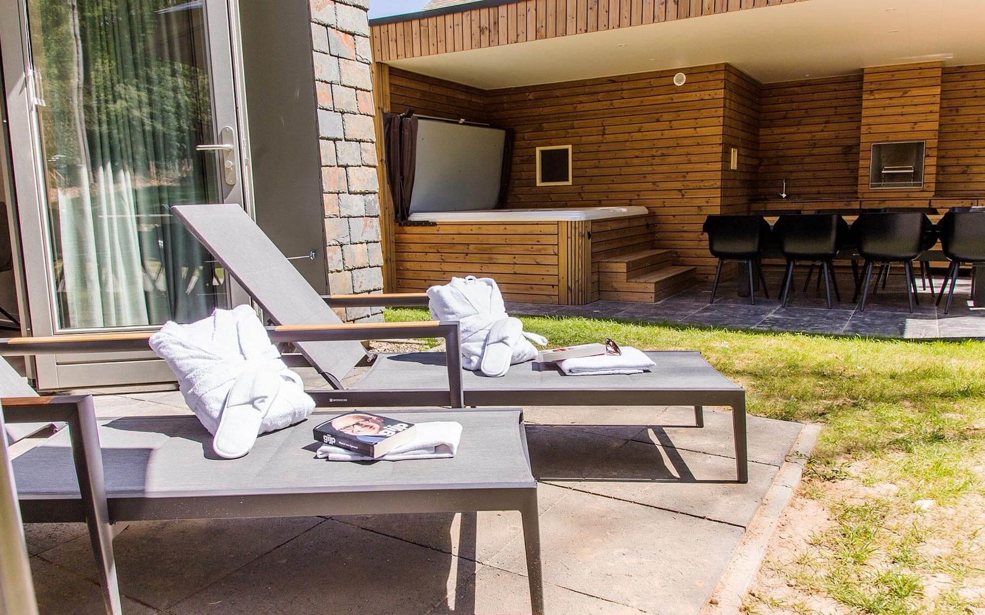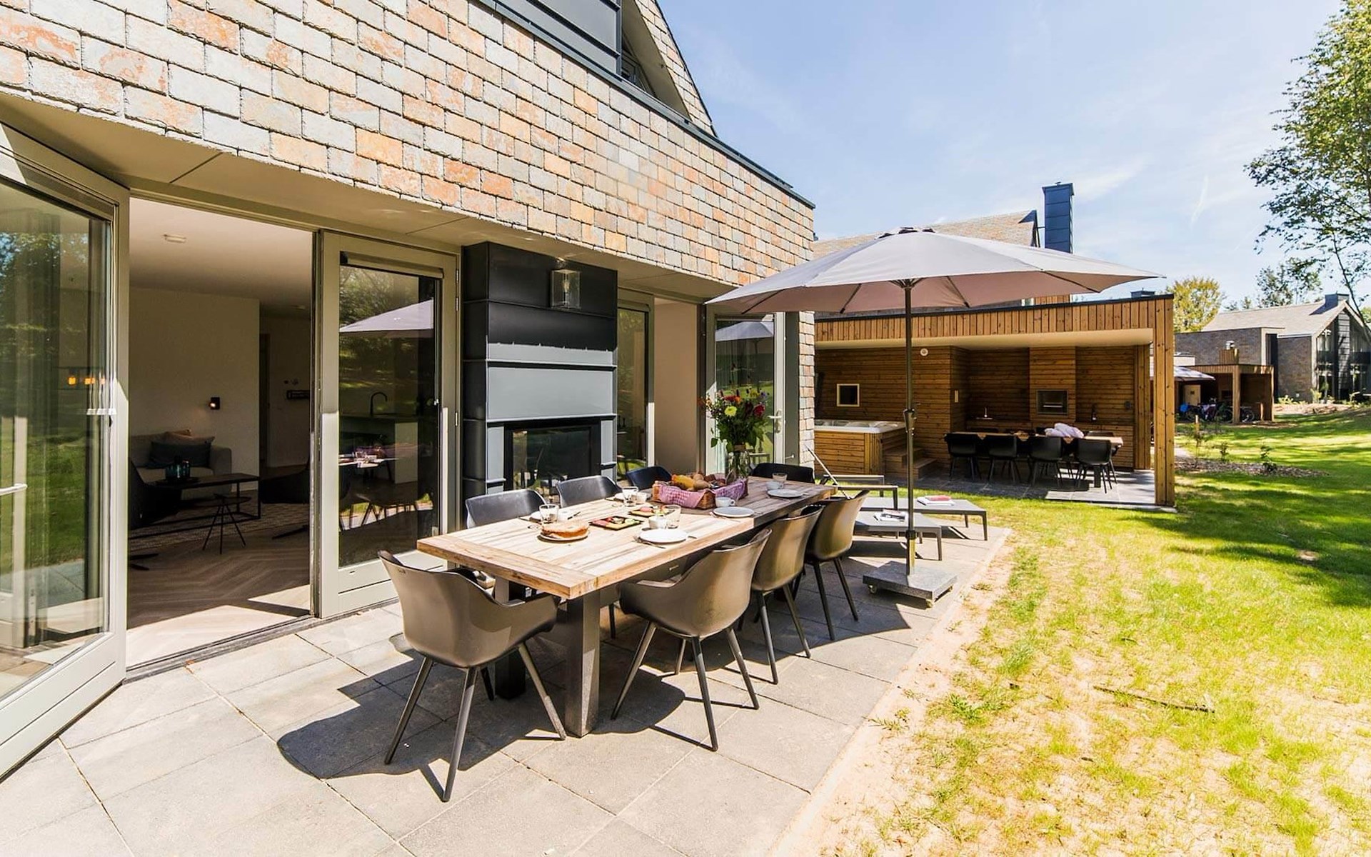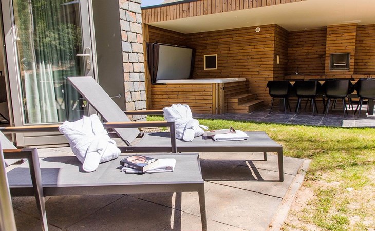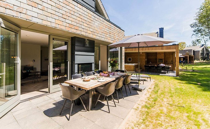 Ook buiten is het goed toeven, bij de villa is een gemeubileerd tuinterras met buitenhaard en luxe buitenwellness met een spa met air- en jetstream, een sauna en een buitendouche. Ook is er een luxe overdekte buitenkeuken met een eethoek.