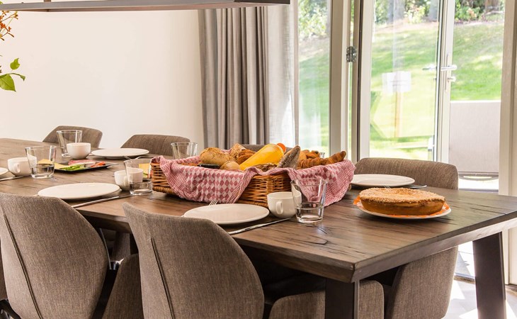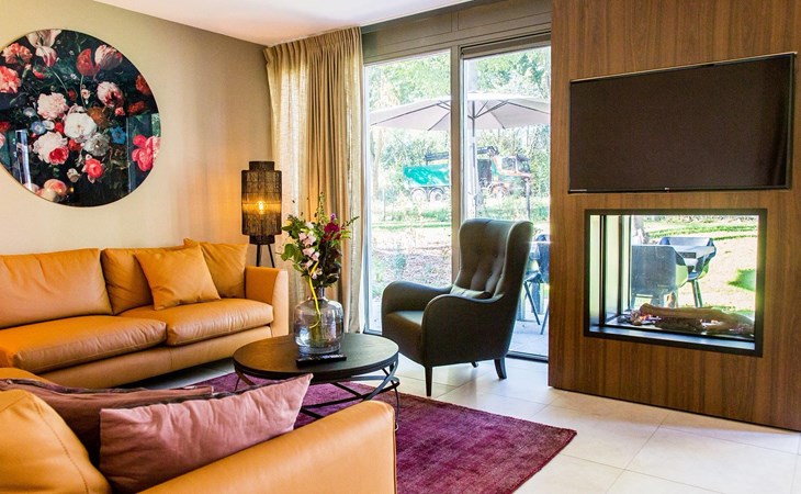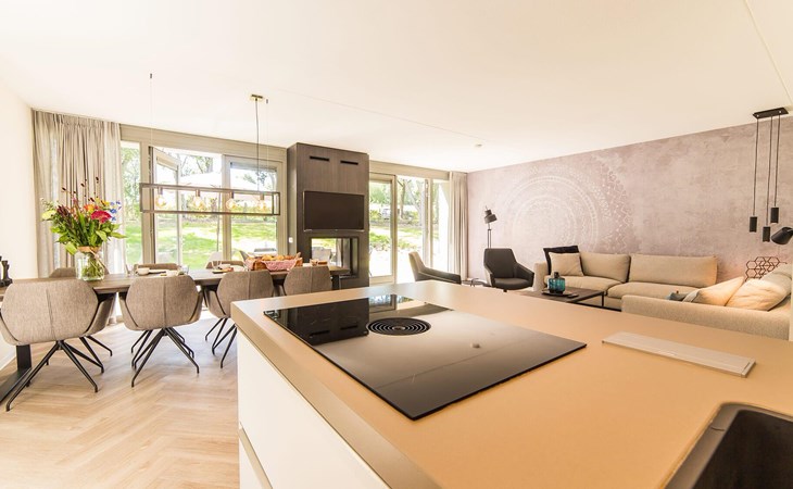 Jullie verblijven met het gezelschap in een zeer lichte en ruime villa met een royale woonkamer voorzien van een comfortabele zithoek met een televisie en een gezellige gashaard. Je hebt de beschikking over een luxe open keuken met een eethoek en luxe apparatuur waaronder een kokendwaterkraan, combi-oven, vaatwasser en een Nespresso apparaat.