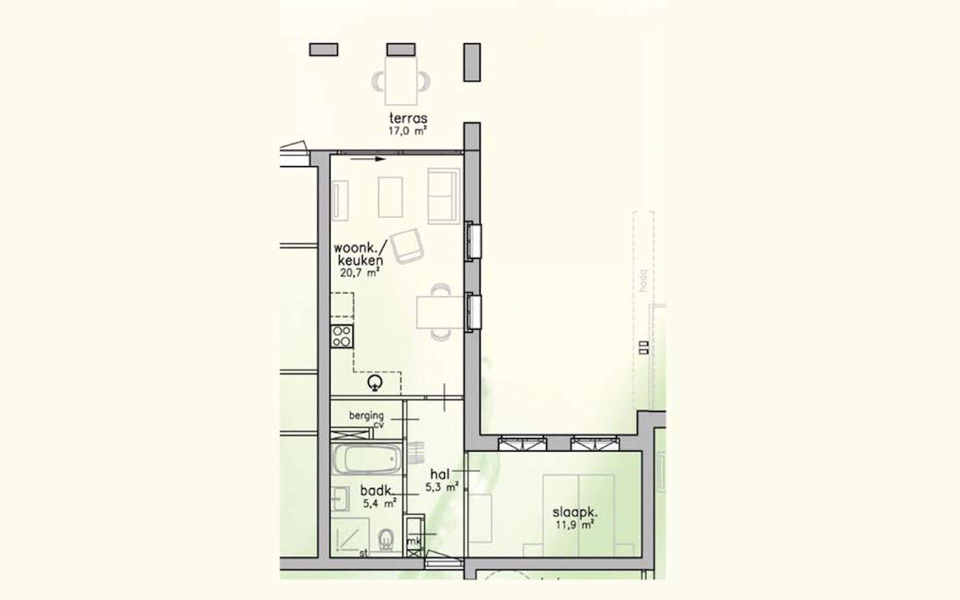 De tweepersoonsslaapkamer in het appartement heeft 2 éénpersoonsbedden. Daarnaast is er een badkamer met een bad en/of douche, wastafel en toilet. Buiten kun je plaatsnemen op het balkon of terras met een zitje om te genieten van een heerlijk drankje. Het appartement heeft een separate berging waar je bijvoorbeeld je (huur)fietsen veilig kunt neerzetten.