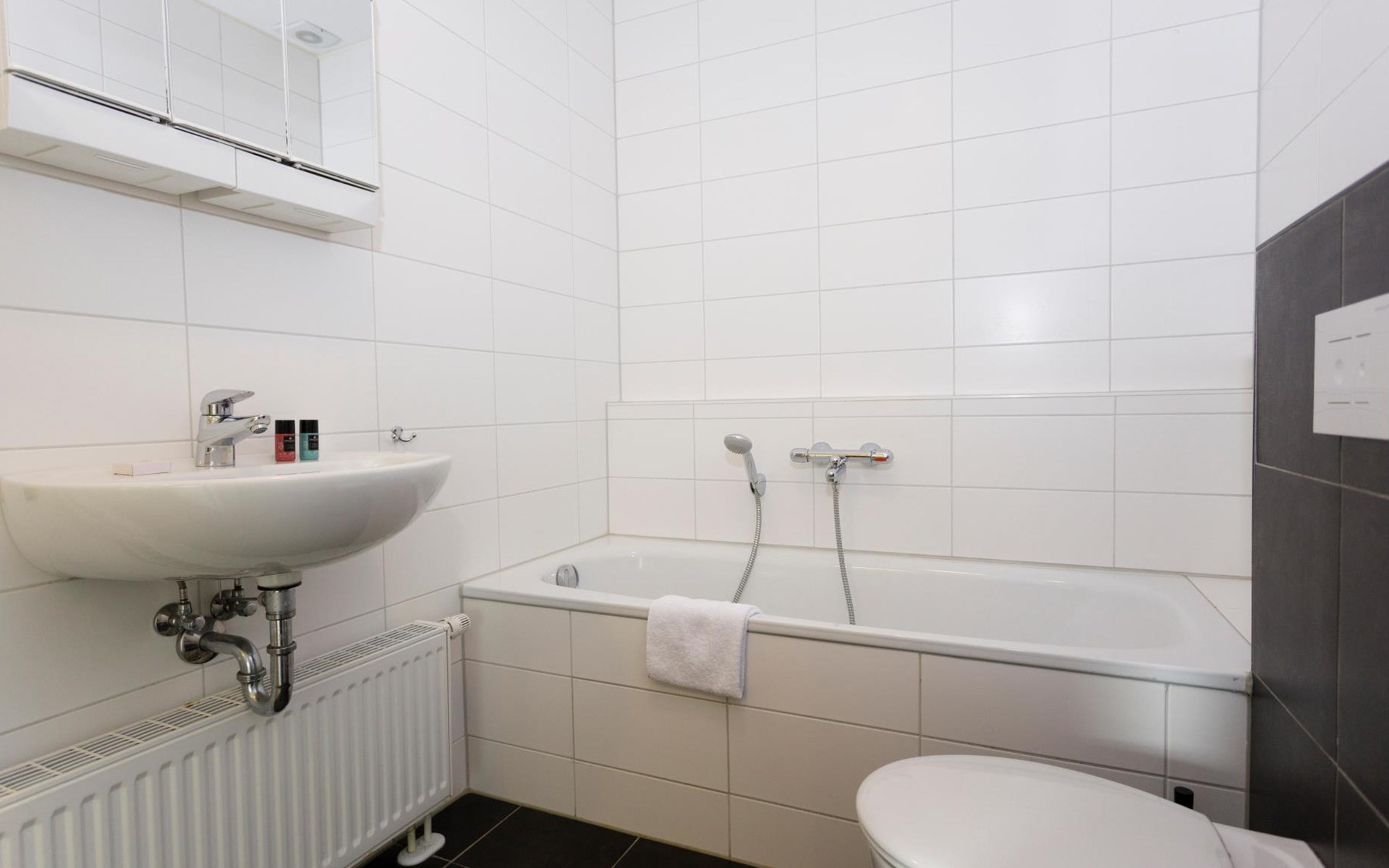 De eerste verdieping bestaat uit 2 slaapkamers met 2 éénpersoonsbedden en een badkamer met een douche, wastafel en toilet. In totaal beschikken 2 van de 4 slaapkamers ook over een televisie.