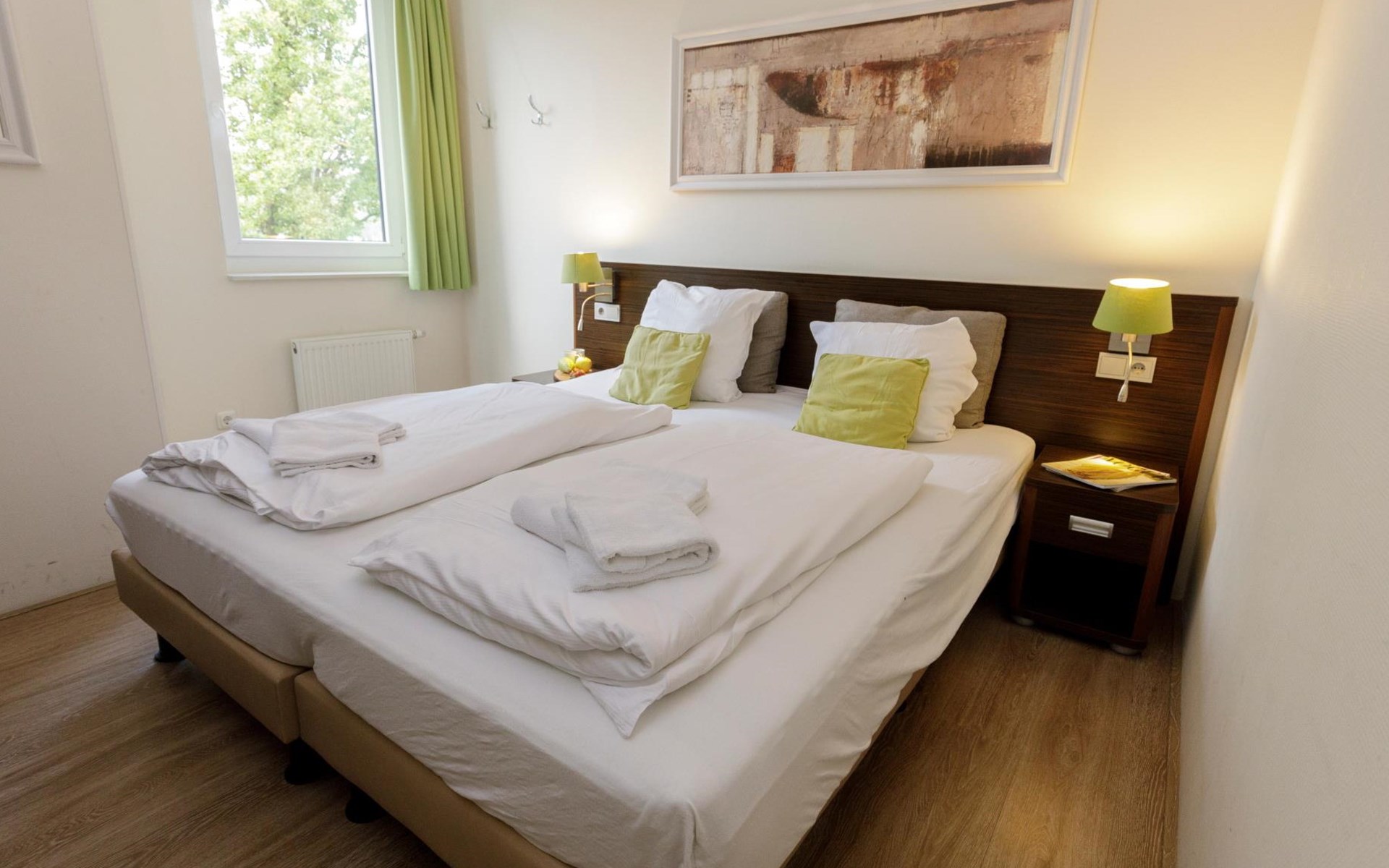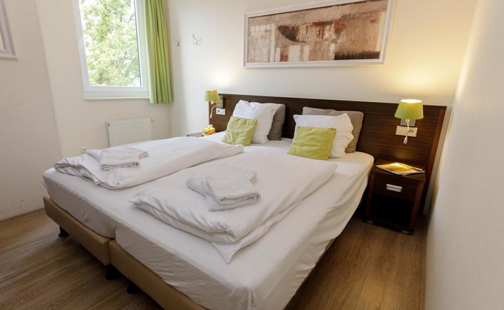 Eén slaapkamer beschikt over een tweepersoonsbed en televisie. De andere slaapkamer heeft 2 éénpersoonsbedden. De badkamer is voorzien van een ligbad, aparte douche, wastafel én zelfs een privé sauna. Daarnaast is er een separaat toilet in het appartement aanwezig.