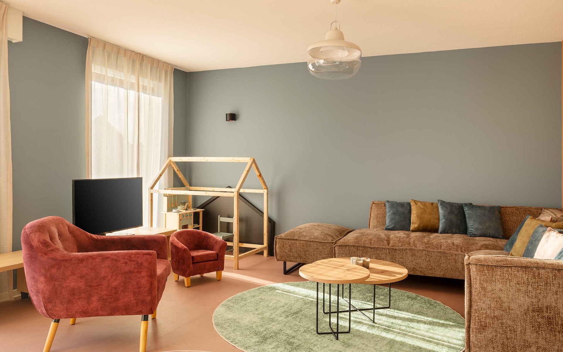 De openslaande deuren in de woonkamer geven toegang tot een ruime tuin met gemeubileerd terras. De tuin grenst aan de gemeenschappelijke speelplaats of beschikt over een privé speeltuin. Je kinderen zullen zich zeker niet vervelen tijdens jullie verblijf!