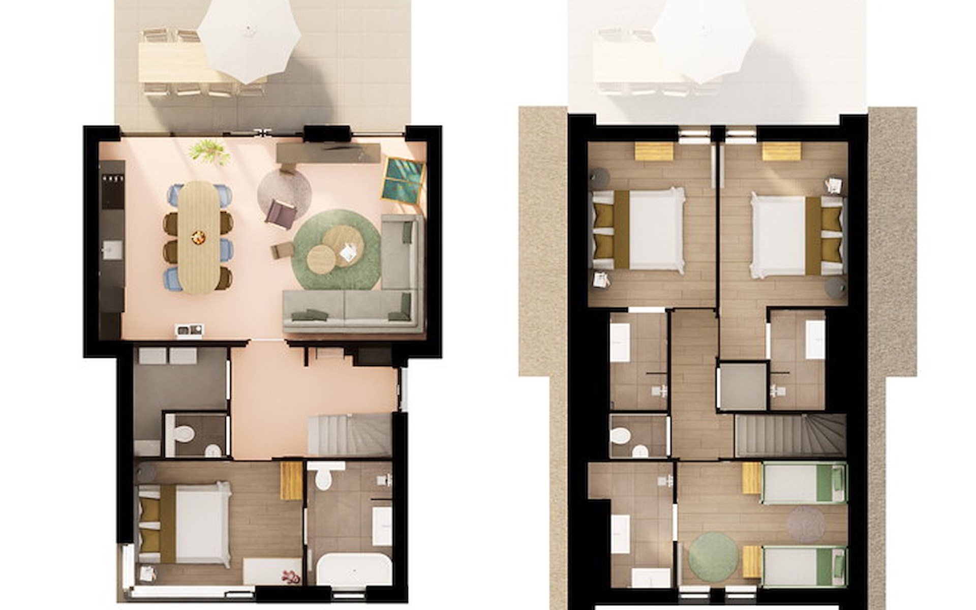 Op de eerste verdieping zijn er in totaal 3 slaapkamers. Twee slaapkamers beschikken over 2 éénpersoonsbedden en een comfortabele en-suite badkamer met een douche en wastafel. Eén van deze slaapkamers heeft een smart-tv die je de mogelijkheid biedt om te streamen. De kinderslaapkamer is voorzien van 2 éénpersoons bedstedes en een en-suite badkamer met een douche en wastafel. Bovendien is er een separaat toilet op de eerste verdieping aanwezig. Bij de trap bevindt zich een traphekje.