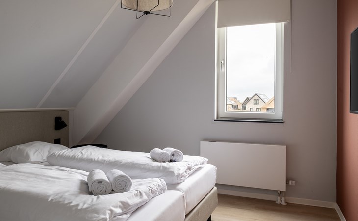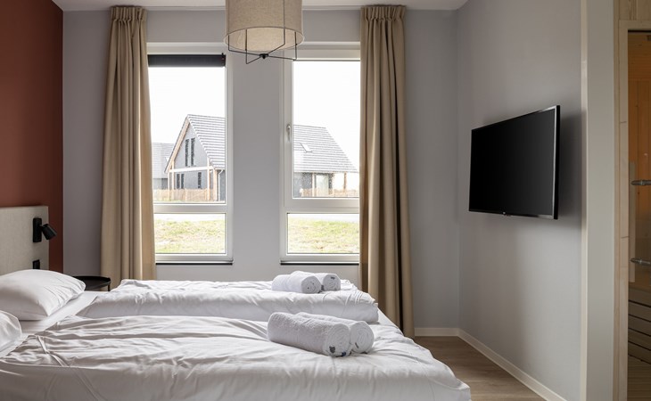 Op de begane grond bevinden zich 2 slaapkamers met elk 2 éénpersoonsbedden, waarvan 1 slaapkamer een smart-tv heeft met streaming mogelijkheid. Beide slaapkamers hebben een en-suite badkamer met douche en wastafel, waarvan één badkamer over een privé sauna beschikt en de andere badkamer over een ligbad. Daarnaast is er een separaat toilet aanwezig.