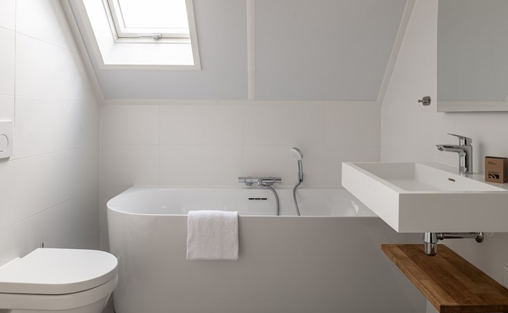 Op de eerste verdieping zijn nog 5 tweepersoonsslaapkamers te vinden met elk 2 éénpersoonsbedden. Twee slaapkamers beschikken over een smart-tv met streaming mogelijkheid. Daarnaast zijn er op de eerste verdieping 2 en-suite badkamers met douche, wastafel en toilet, 1 en-suite badkamer met ligbad, douche, wastafel en toilet. De vierde badkamer, die toegankelijk is vanuit de overloop, heeft een douche, wastafel en toilet.