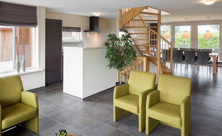 De woonkamer bevindt zich op de begane grond en is ingericht met een zithoek met een smart-tv. De villa heeft een open keuken en een eethoek. De keuken is voorzien van onder andere een koelkast, vriezer, filter koffiezetapparaat, oven, magnetron en een vaatwasser. Daarnaast is er een apart toilet. Er is tevens een wasmachine en een wasdroger aanwezig.