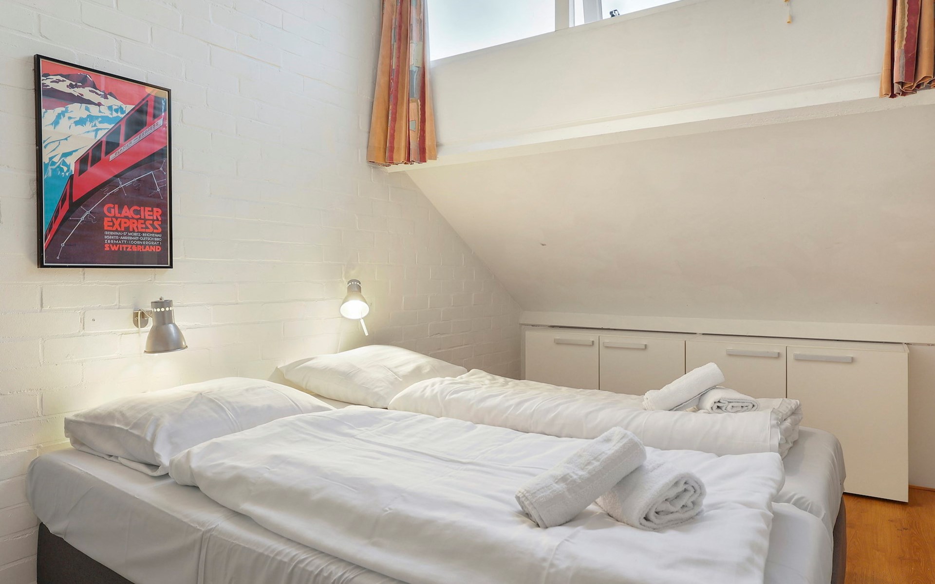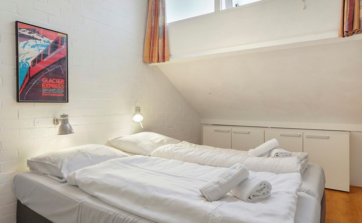De eerste verdieping heeft 2 slaapkamers. In één van de slaapkamers staan 2 éénpersoons boxsprings. De andere slaapkamer heeft 1 éénpersoons boxspring.