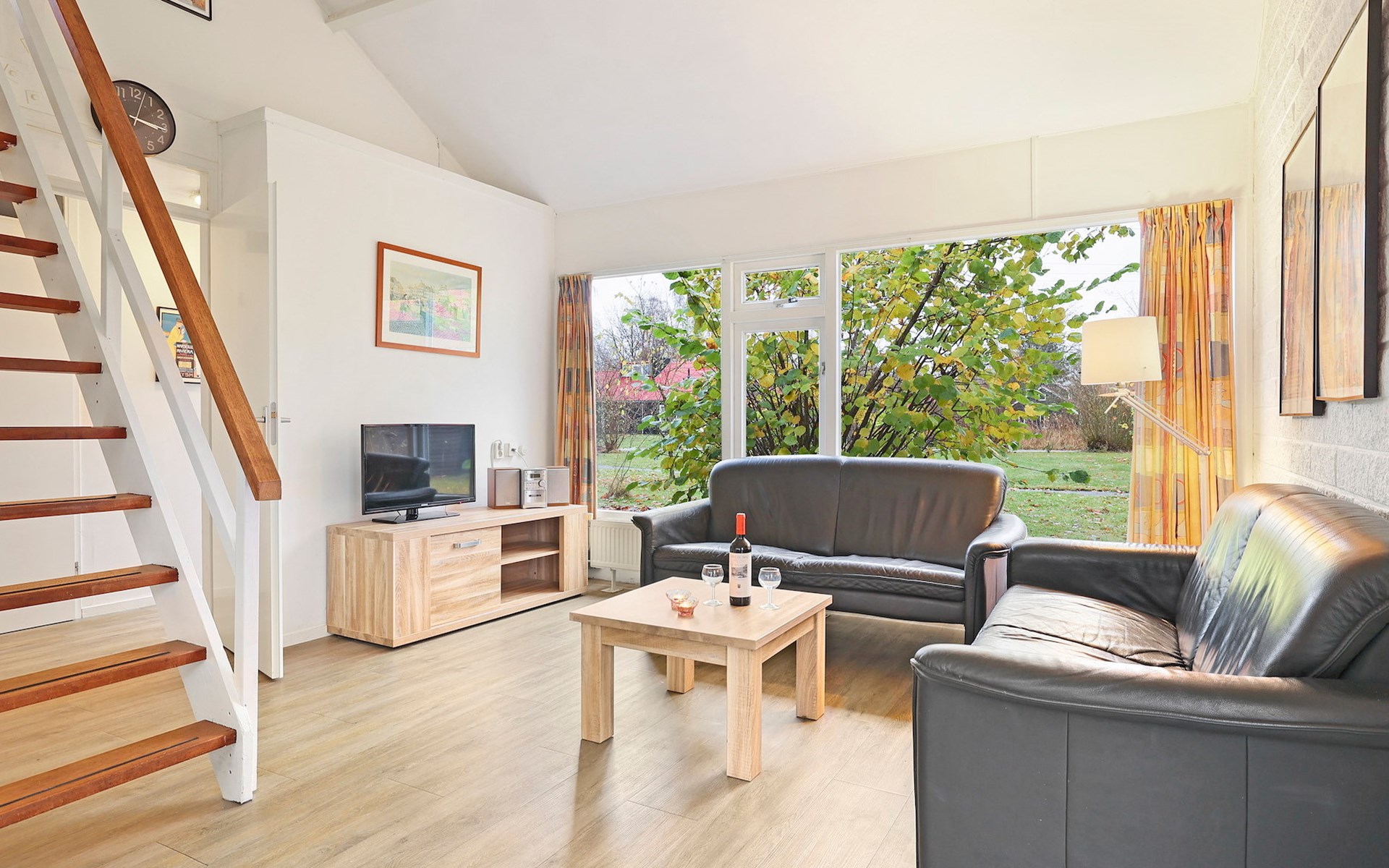 De woonkamer is ingericht met een zithoek, televisie, cd-speler en een radio en grenst aan de open keuken met eethoek. Deze keuken is voorzien van onder andere een koelkast, magnetron, filterkoffiezetapparaat en een vaatwasser.