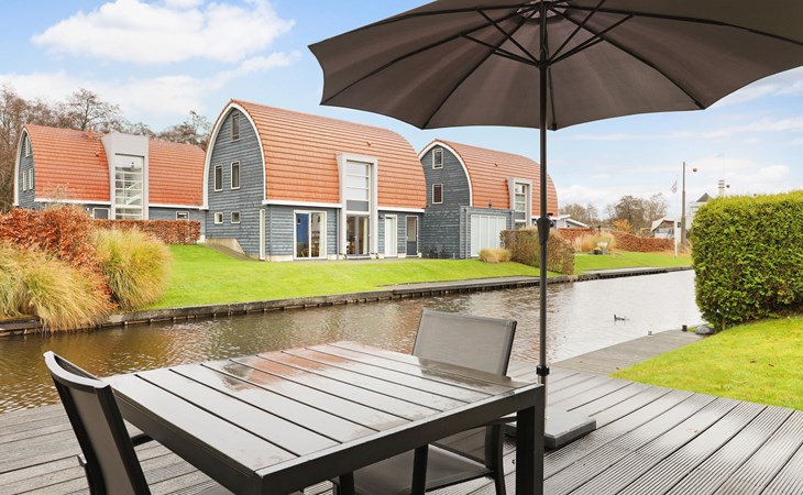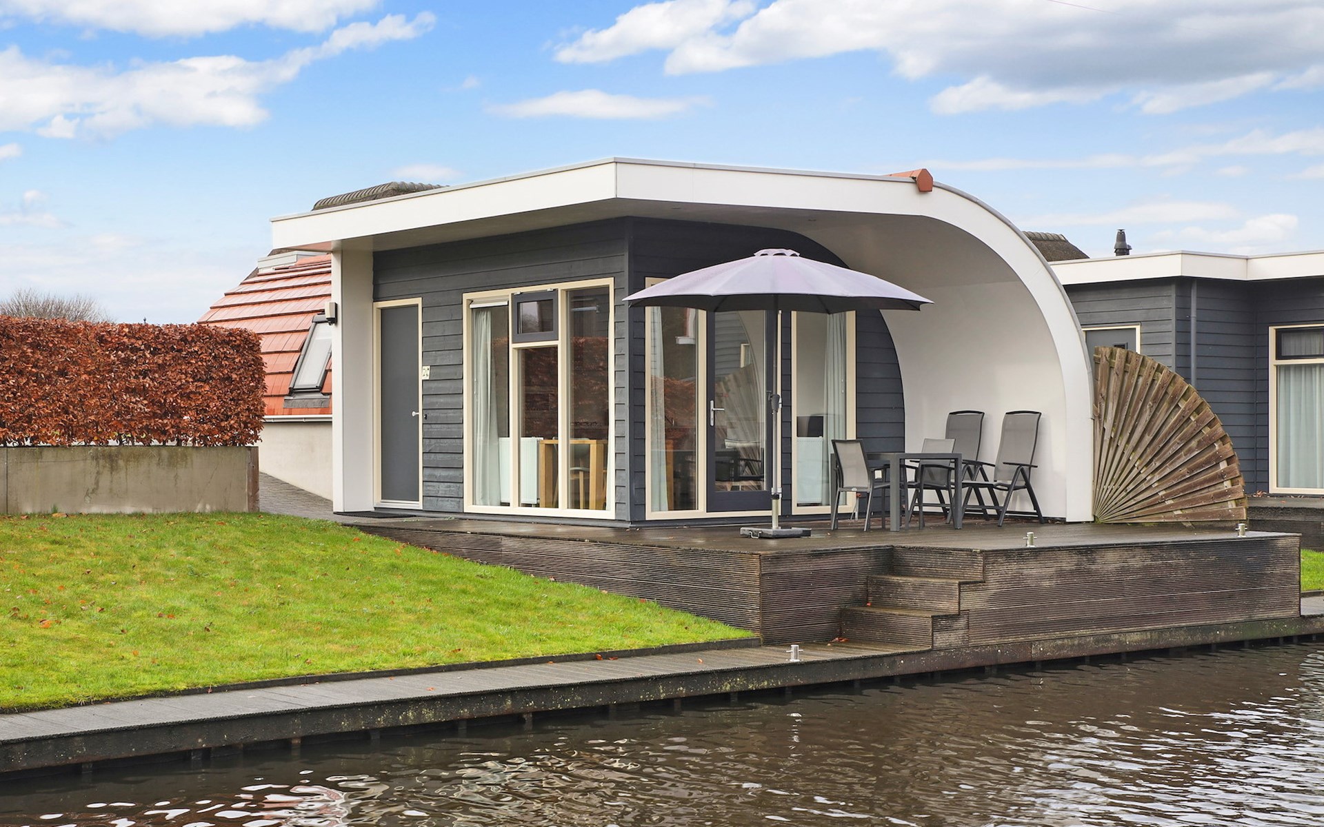 Buiten is een gemeubileerd terras met een parasol en de bungalow heeft een aanlegsteiger.