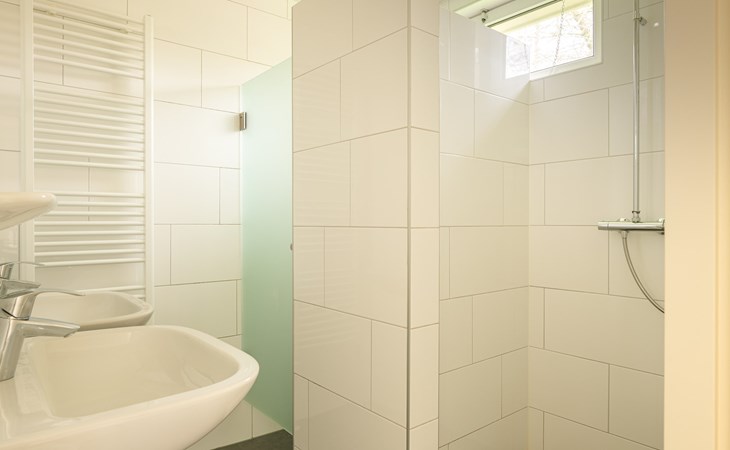 Op de begane grond bevindt zich 1 badkamer. De badkamer beschikt over een douche en een wastafel. Ook zijn er 2 aparte toiletten aanwezig. De bungalow heeft daarnaast een berging.