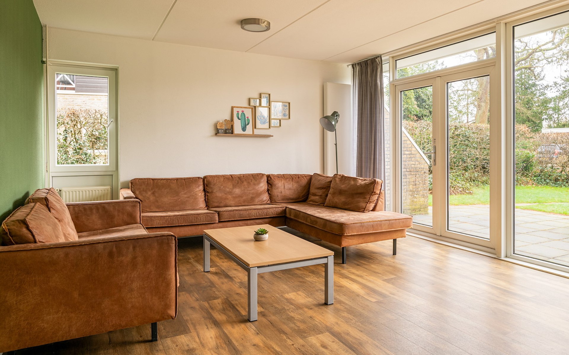 De woonkamer is ingericht met een zithoek, televisie en een gashaard. De bungalow heeft een open keuken met een eethoek. De keuken is voorzien van onder andere een koelkast met vriesvak, vriezer, oven, Nespresso apparaat en een vaatwasser.