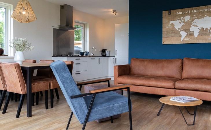 De woonkamer is ingericht met een zithoek en een televisie. De bungalow heeft een open keuken met een eethoek. De keuken is voorzien van onder andere een koelkast met vriesvak, vriezer, Senseo apparaat, combimagnetron en een vaatwasser.
