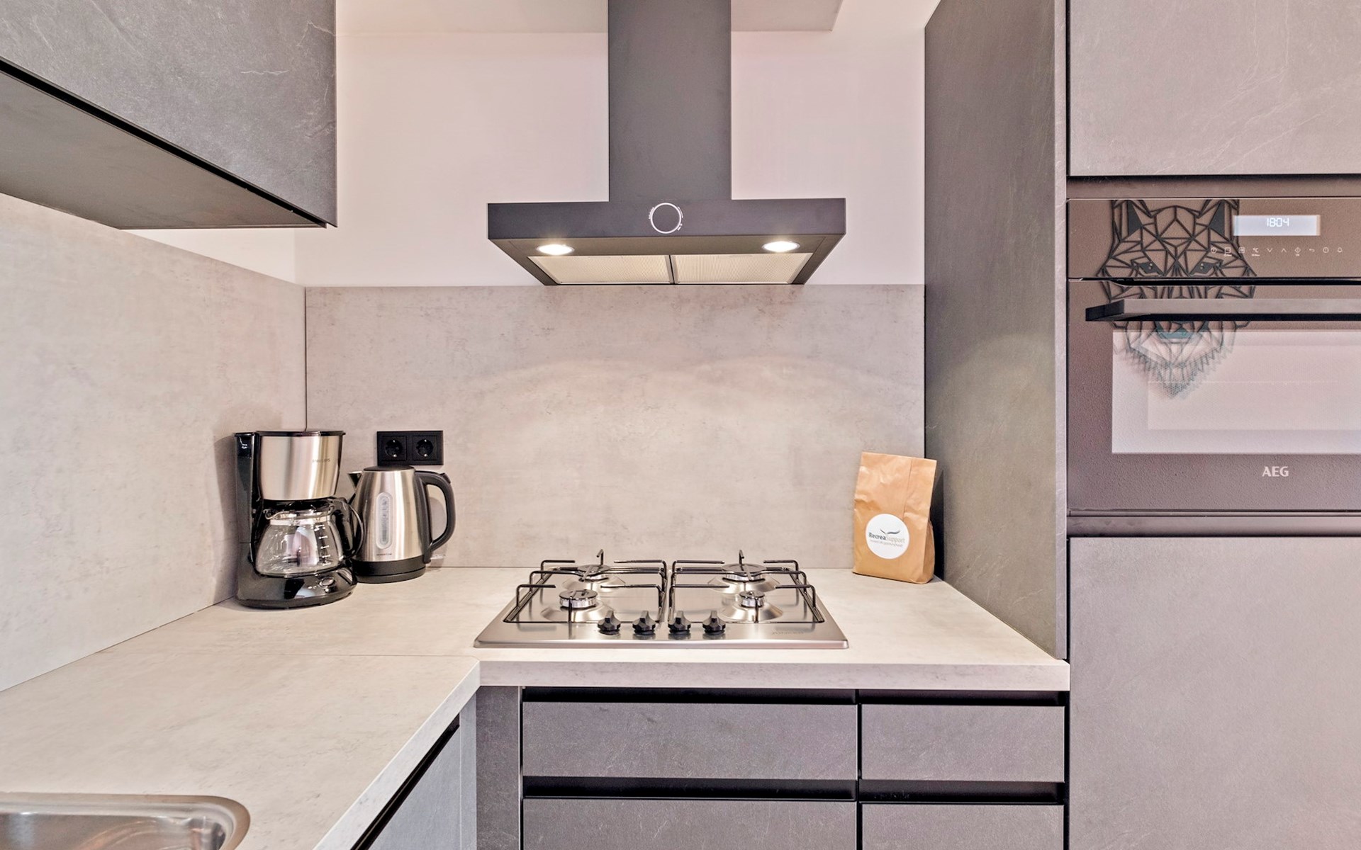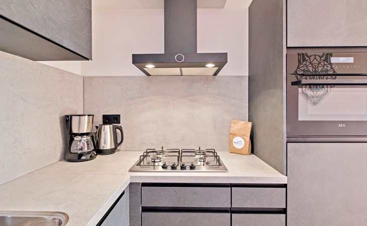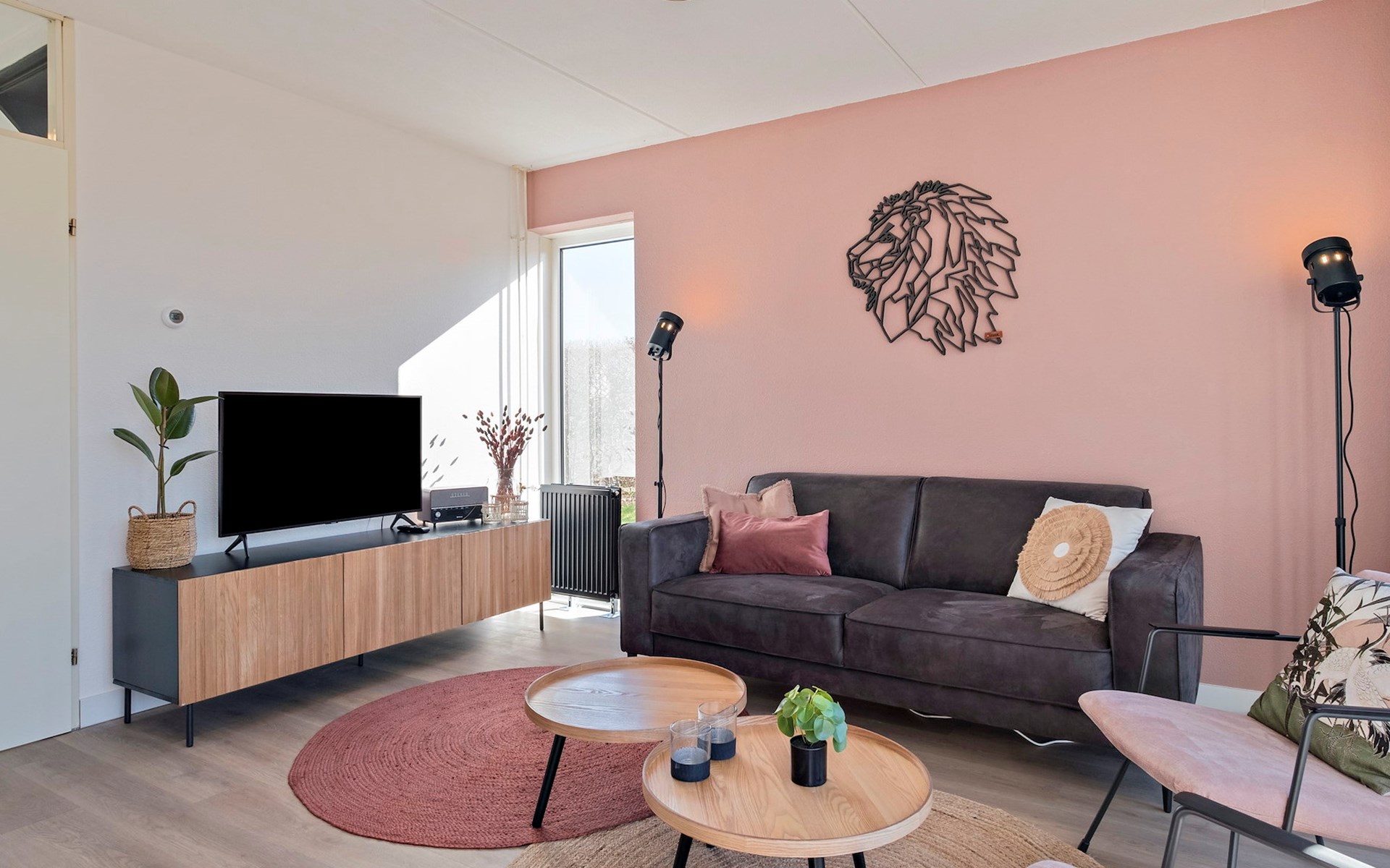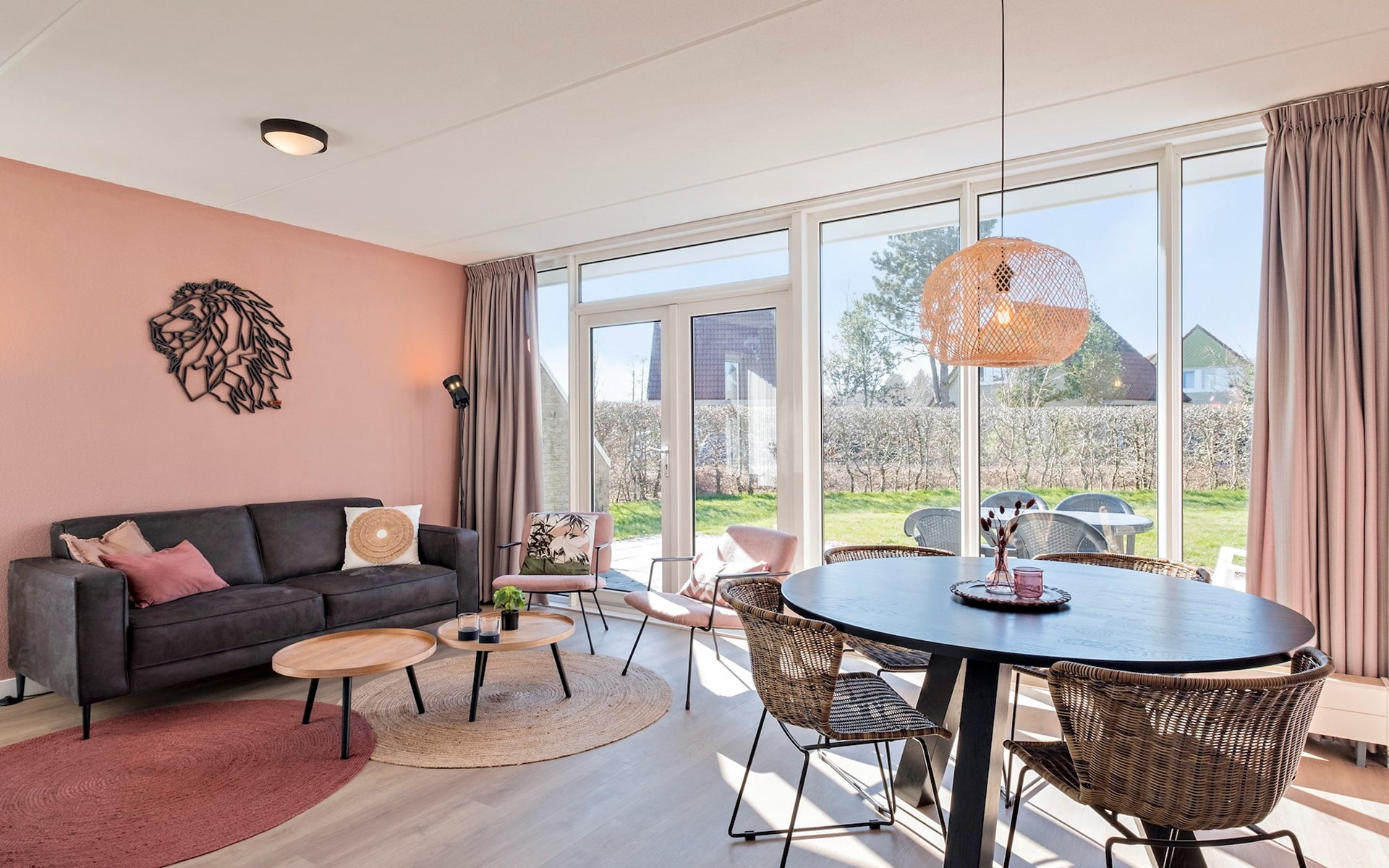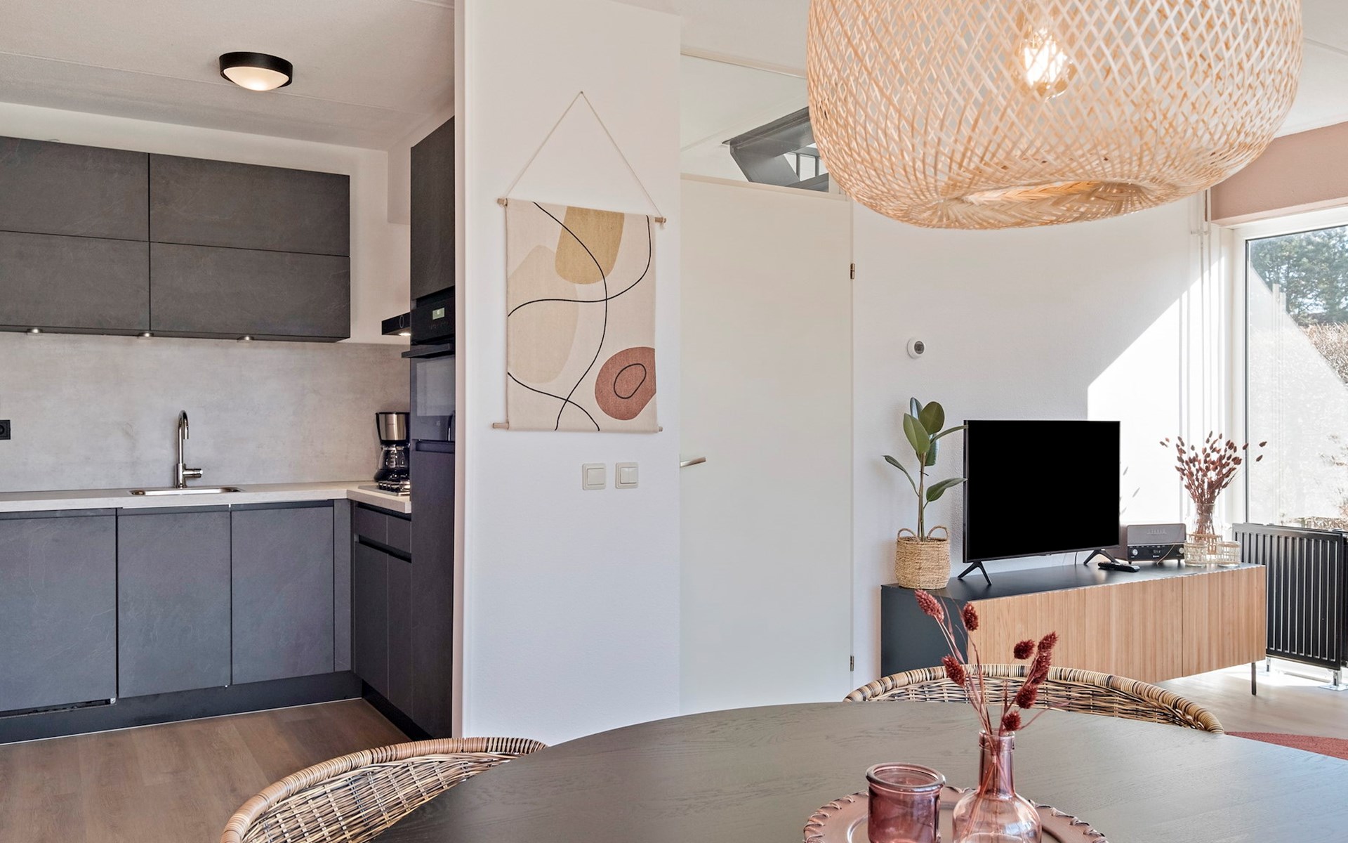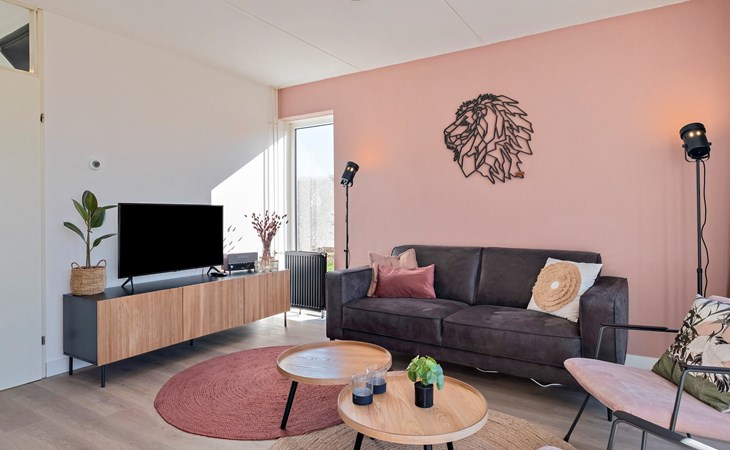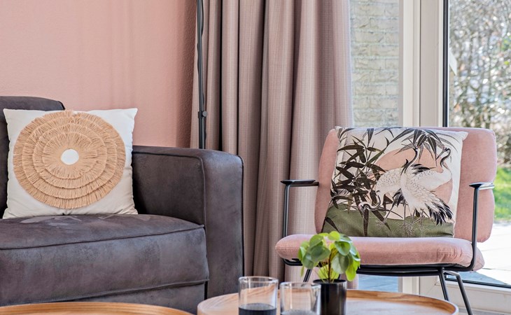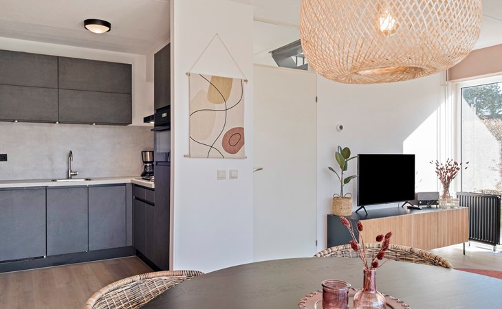 De woonkamer is ingericht met een zithoek en een smart-tv. De bungalow heeft een open keuken met een eethoek. De keuken is voorzien van onder andere een koelkast zonder vriesvak, filterkoffiezetapparaat, Nespresso apparaat, combimagnetron en een vaatwasser.