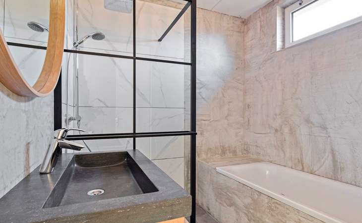 De badkamer bevindt zich op de begane grond en heeft een ligbad, een inloopdouche en een wastafel. Ook is er een apart toilet aanwezig. De woning beschikt daarnaast over een berging en een wasmachine.
