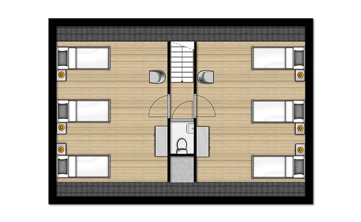Op de eerste verdieping bevinden zich 2 slaapkamers. In de slaapkamers staan elk 3 éénpersoonsbedden of 2 éénpersoonsbedden met een bedstee voor 2 kinderen.