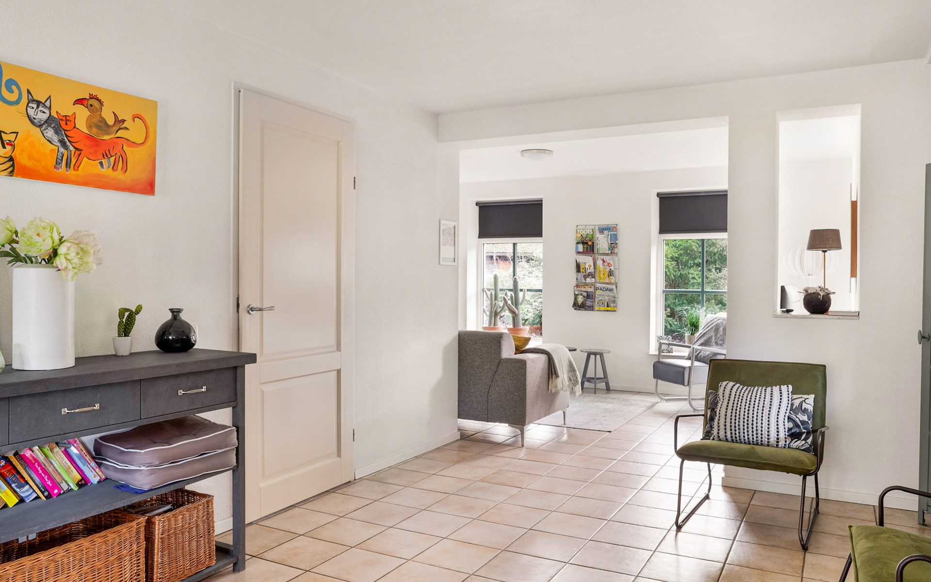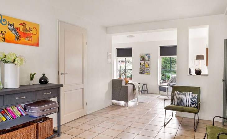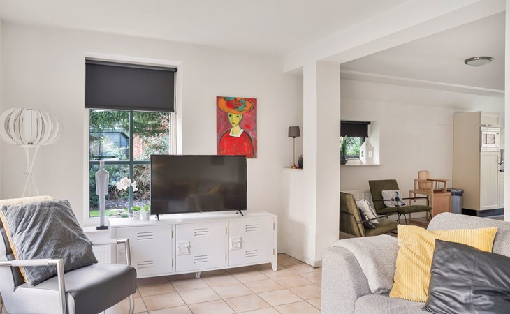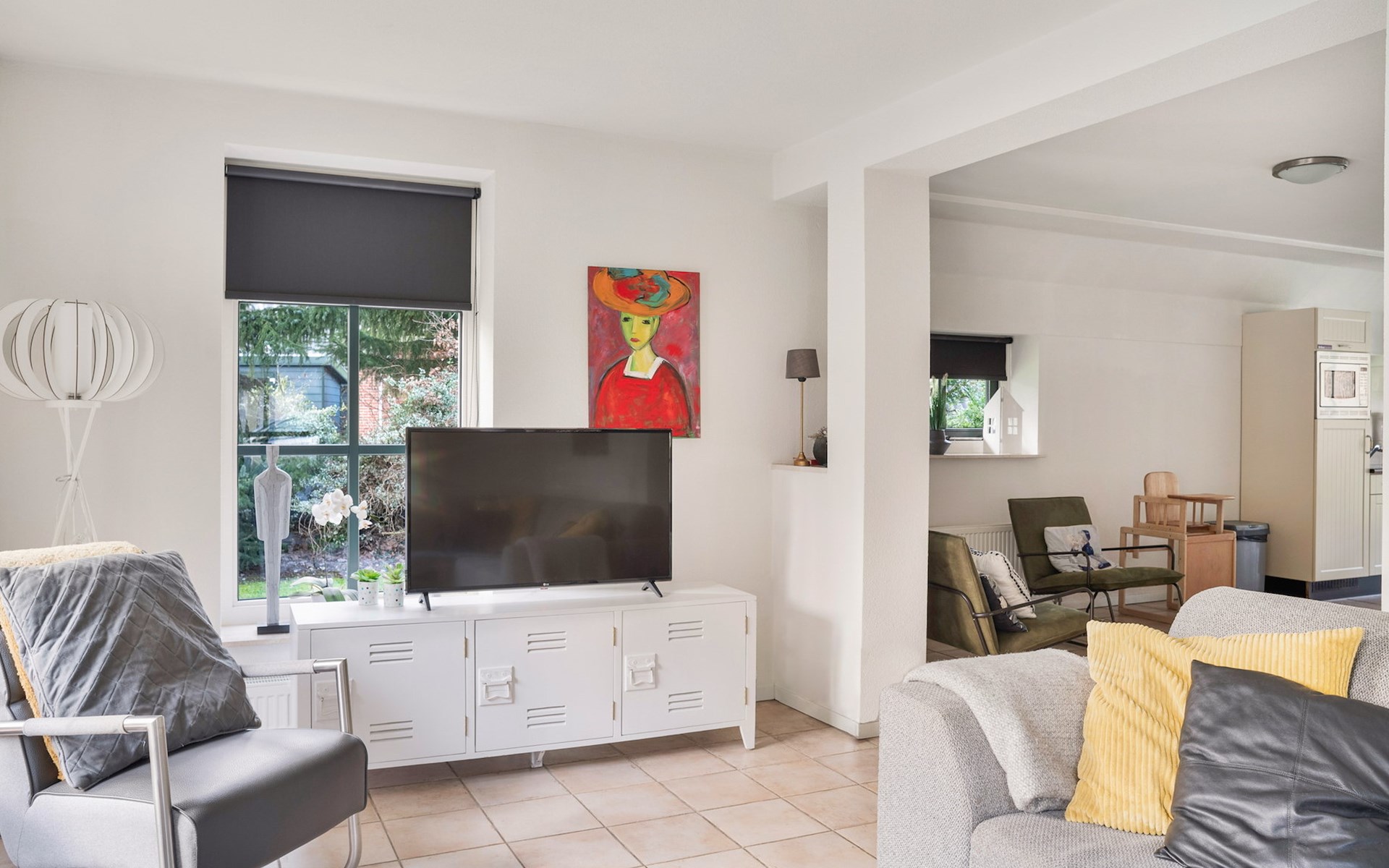 De woonkamer is ingericht met een zithoek, welke grenst aan de open keuken met de eethoek. Deze keuken is voorzien van onder andere een koelkast met vriesvak, filterkoffiezetapparaat, combimagnetron en een vaatwasser.