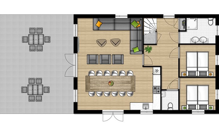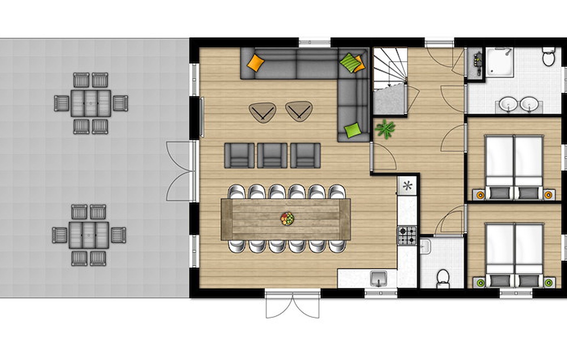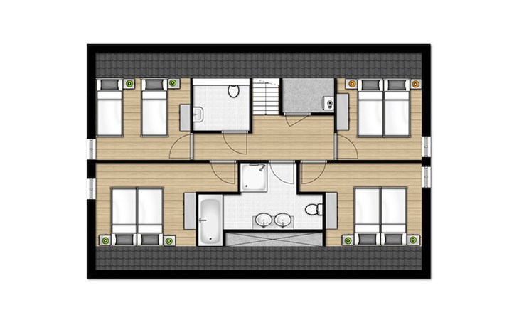 De vrijstaande Type F bungalow Comfort 12 op Summio Landgoed Het Grote Zand is geschikt voor maximaal 12 personen. Deze bungalow bestaat uit 2 verdiepingen en heeft 6 slaapkamers en 2 badkamers.