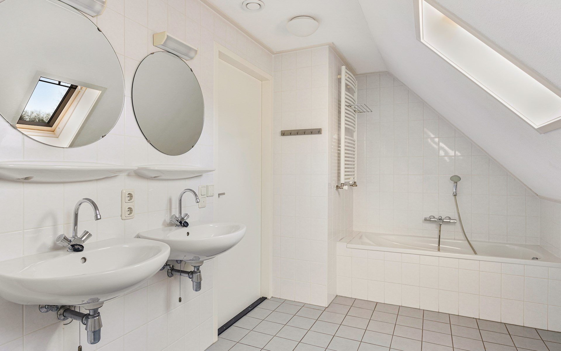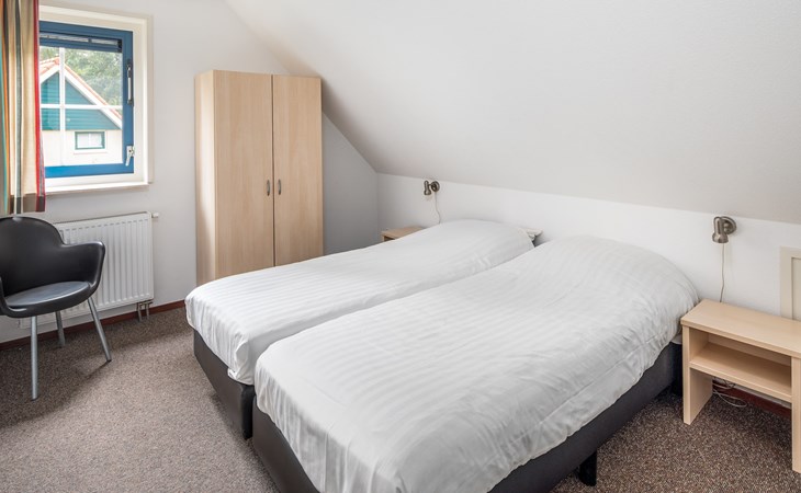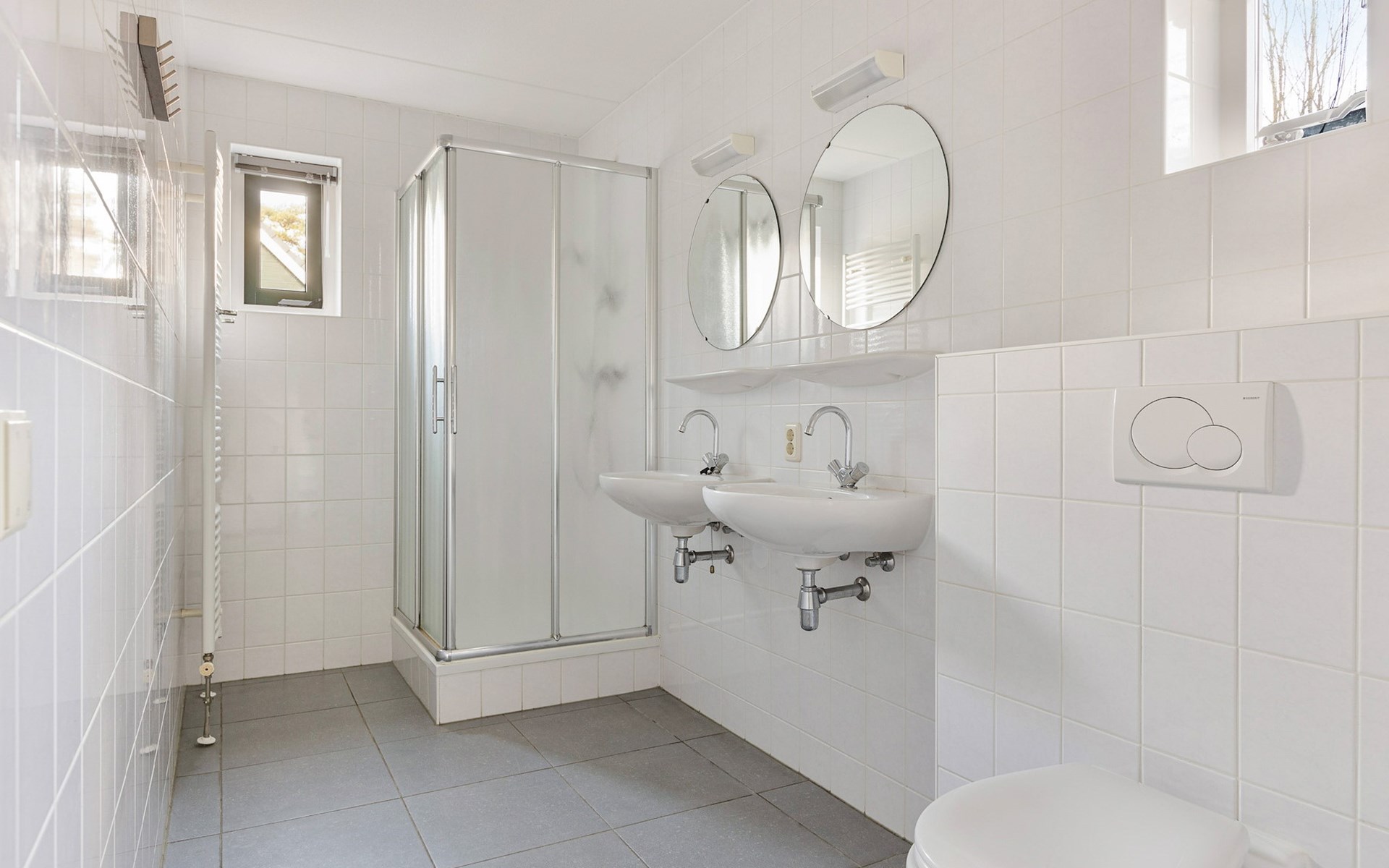 Er bevinden zich 2 slaapkamers en 1 badkamer op de begane grond. Beide slaapkamers hebben 2 éénpersoonsbedden. De badkamer beschikt over een douche, dubbele wastafel en een toilet. Ook is er een apart toilet op de begane grond.