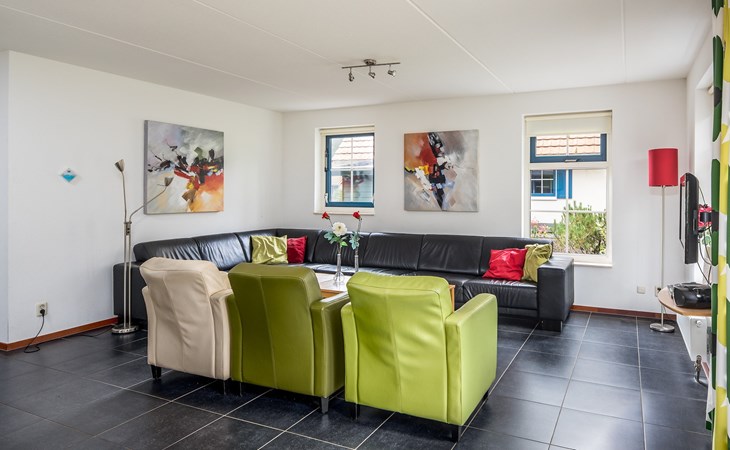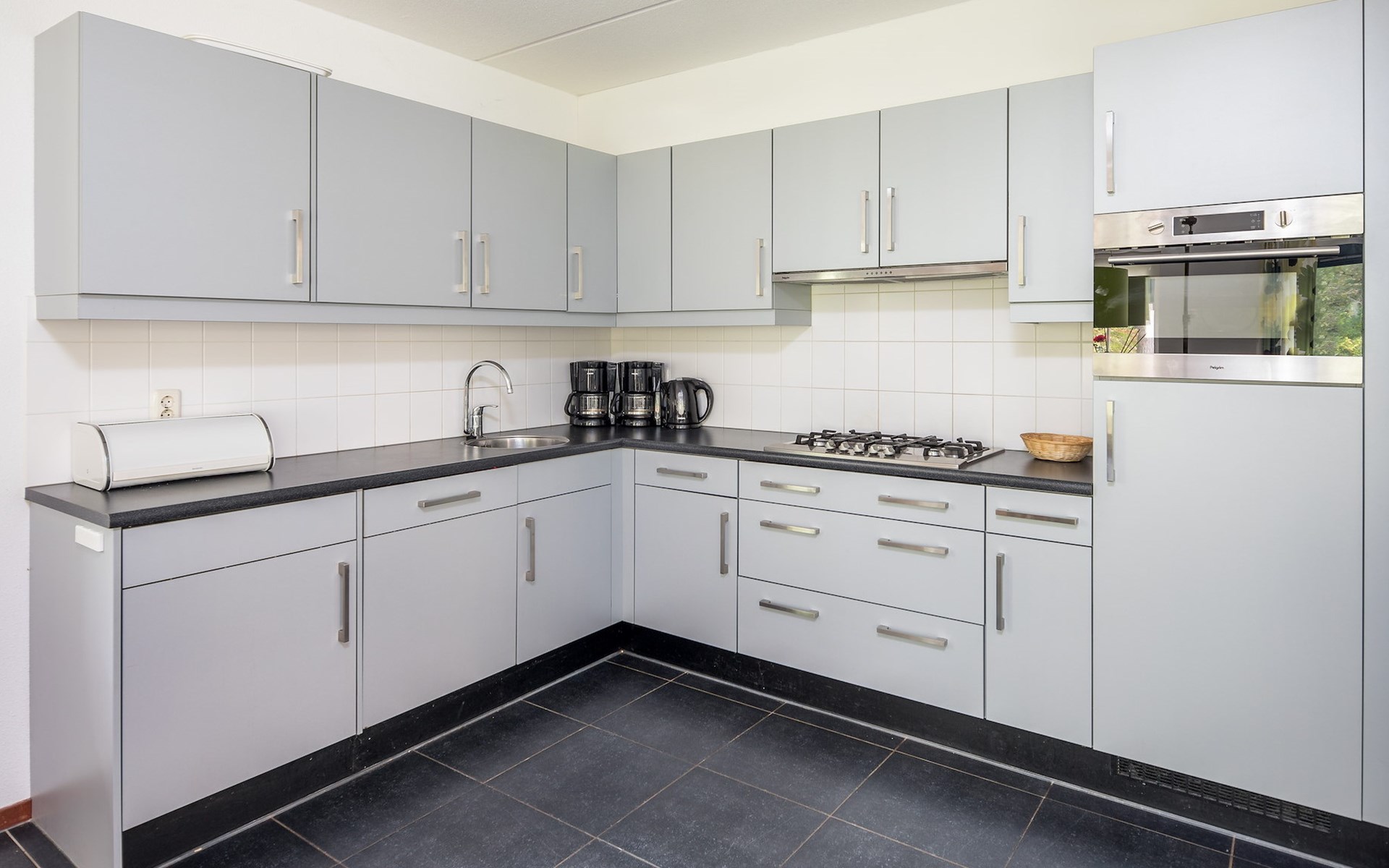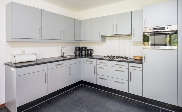 De woonkamer is ingericht met een zithoek en grenst aan de open keuken met de eethoek. Deze keuken is voorzien van onder andere een koelkast met vriesvak, filterkoffiezetapparaat, combimagnetron en een vaatwasser.