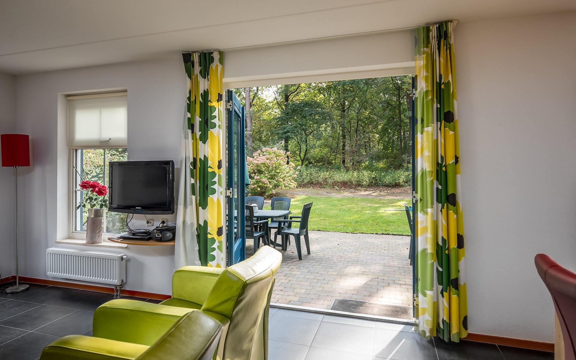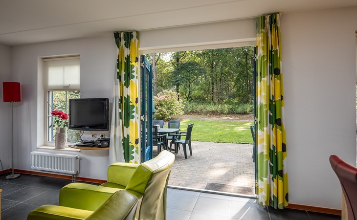 Vanuit de woonkamer heb je via de openslaande deuren toegang tot het ruime, gemeubileerde terras met een parasol.