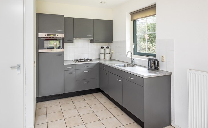 De woonkamer is ingericht met een zithoek, welke grenst aan de open keuken met de eethoek. Deze keuken is voorzien van onder andere een koelkast met vriesvak, filterkoffiezetapparaat, combimagnetron en een vaatwasser.