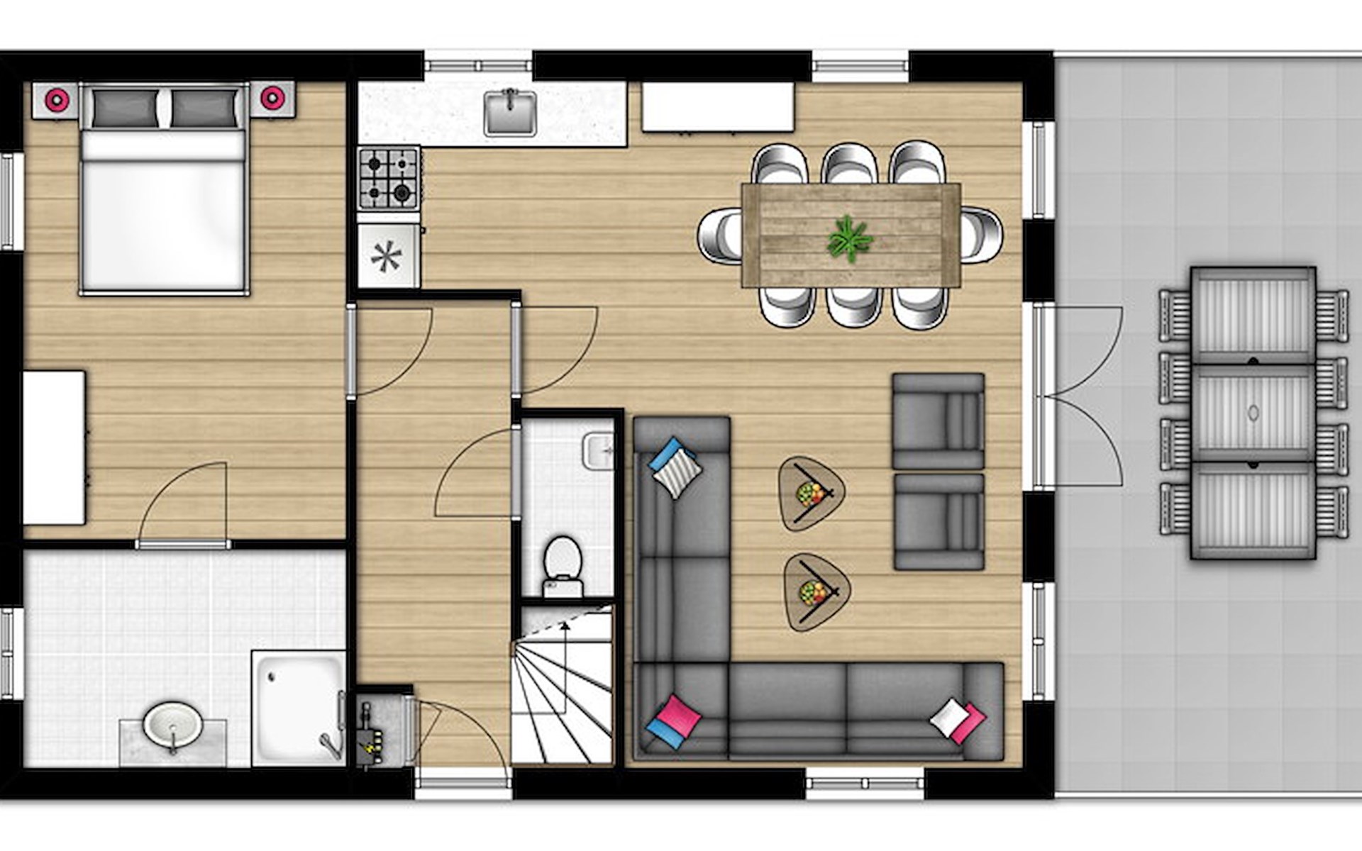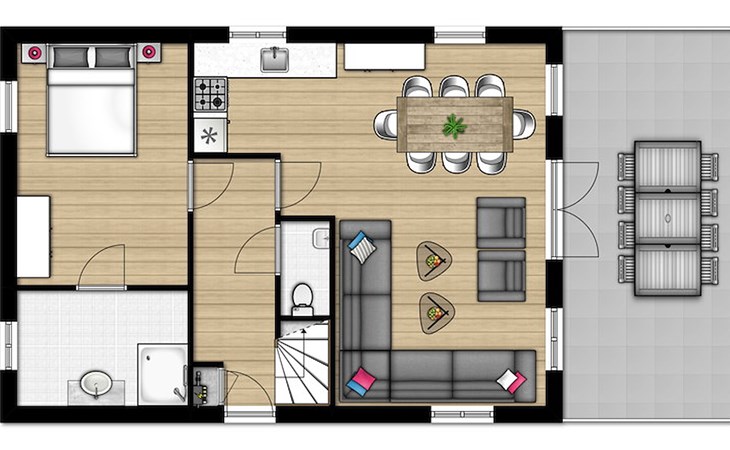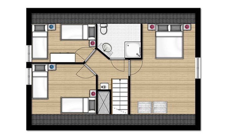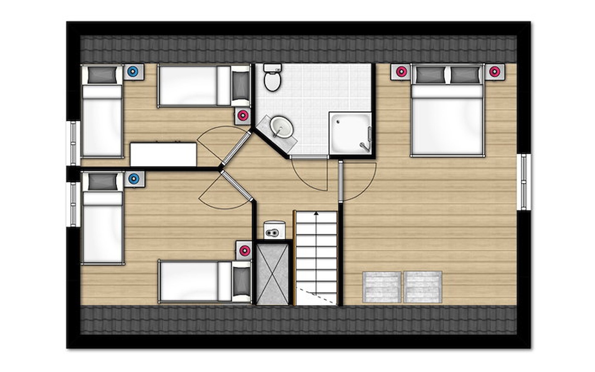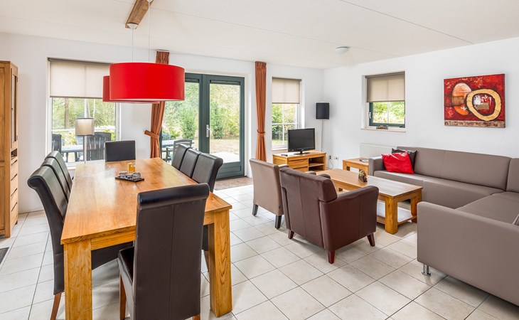 De vrijstaande Type E bungalow Comfort 8 is geschikt voor maximaal 8 personen. Deze bungalow op Summio Landgoed Het Grote Zand bestaat uit 2 verdiepingen en heeft 4 slaapkamers en 2 badkamers.