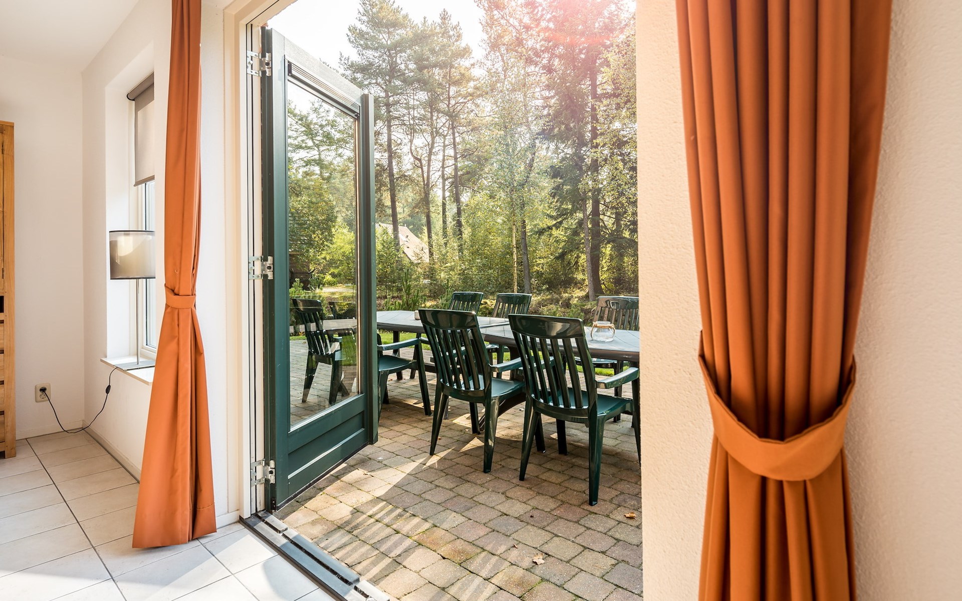Vanuit de woonkamer heb je via openslaande deuren toegang tot het ruime, gemeubileerde terras met een parasol.