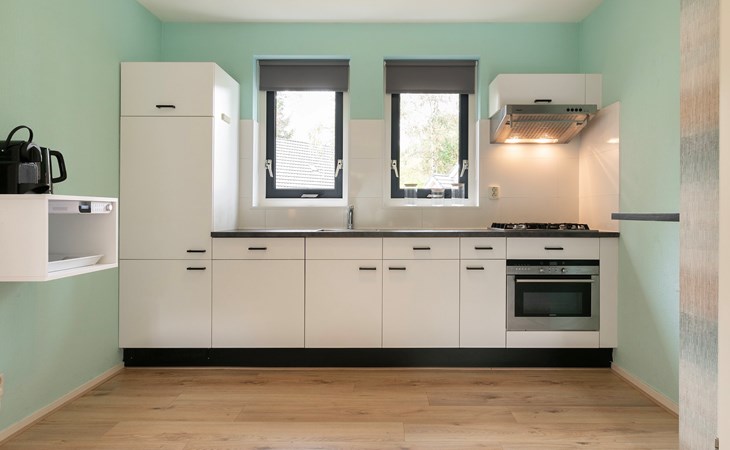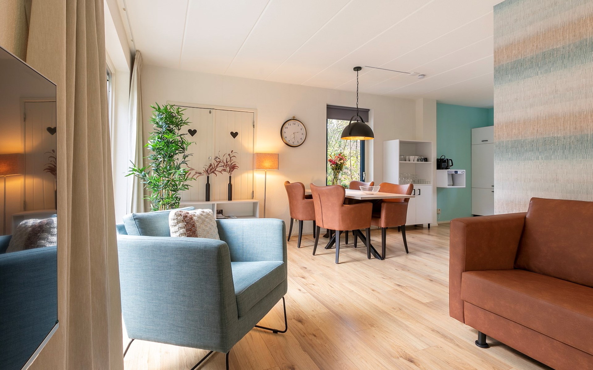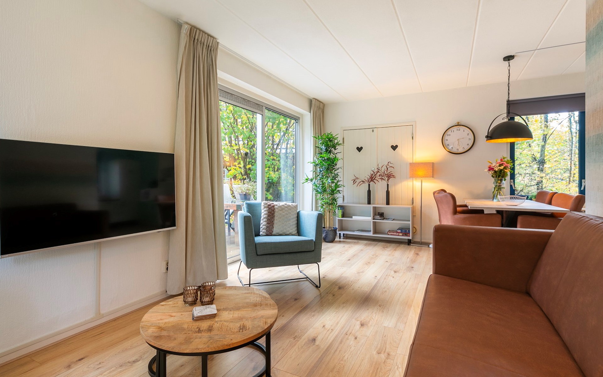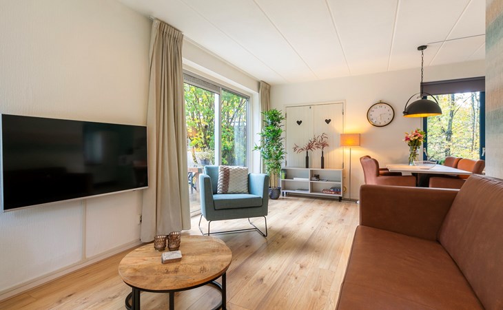 De woonkamer is ingericht met een zithoek en smart-tv met Chromecast en grenst aan de open keuken met een eethoek. Deze keuken is voorzien van onder andere een koelkast met vriesvak, Nespresso apparaat, filterkoffiezet apparaat, combi oven en een vaatwasser.