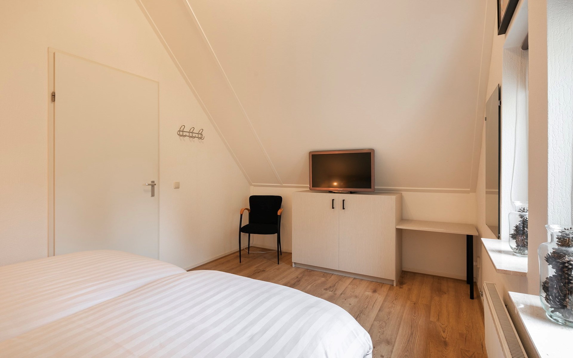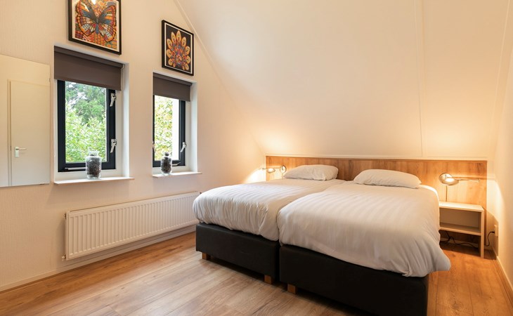 De bungalow heeft 2 slaapkamers elk 2 éénpersoons boxsprings. Deze bevinden zich beide op de eerste verdieping. Eén van de slaapkamers heeft een televisie.