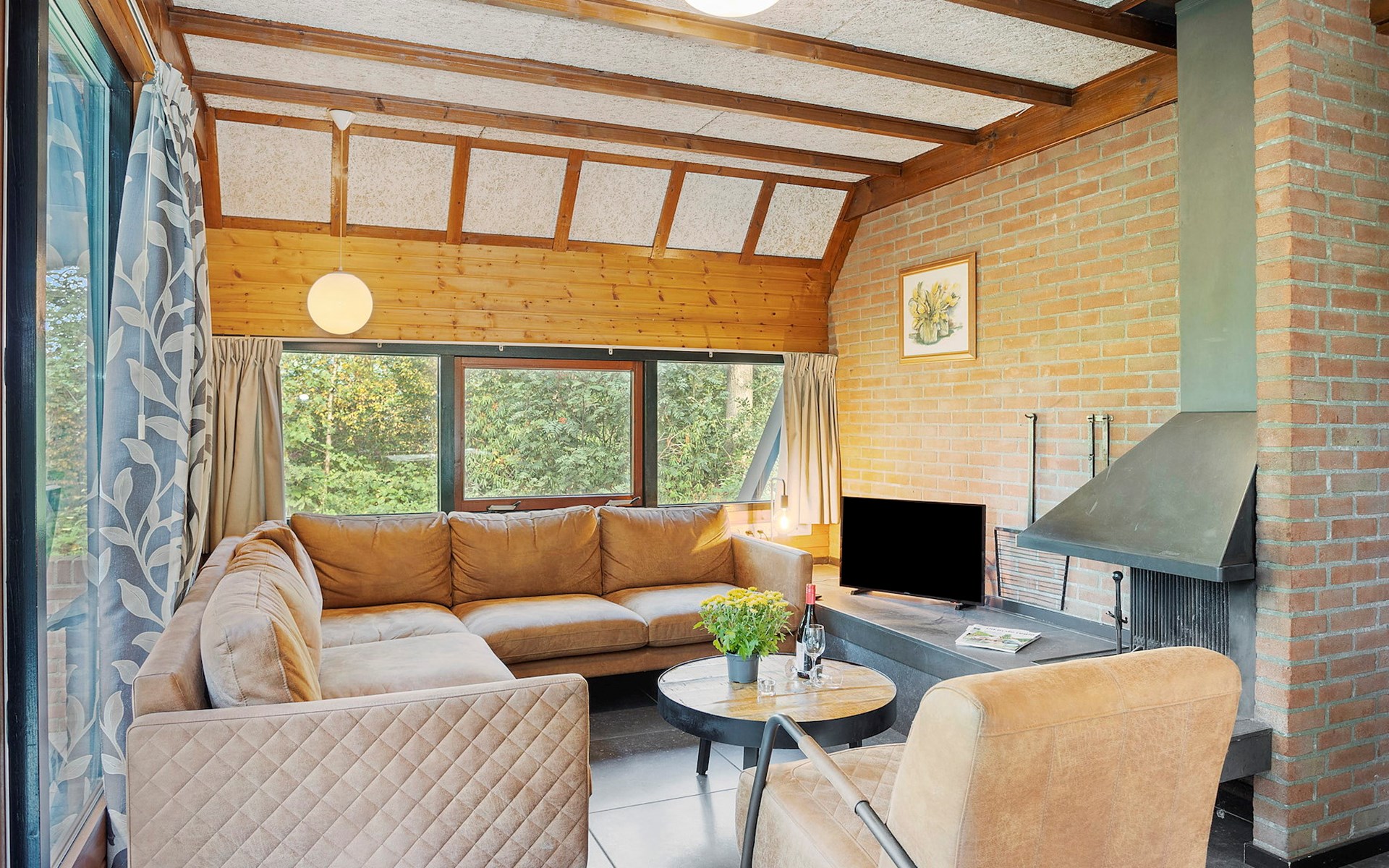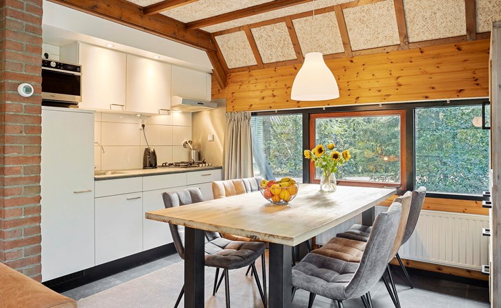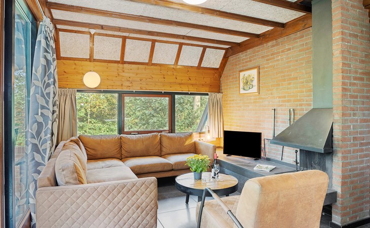 De woonkamer heeft vloerverwarming en is ingericht met een zithoek, televisie en een open haard. De bungalow heeft een open keuken met een eethoek. De keuken is voorzien van onder andere een koelkast met vriesvak, filterkoffiezetapparaat, combimagnetron en een vaatwasser.