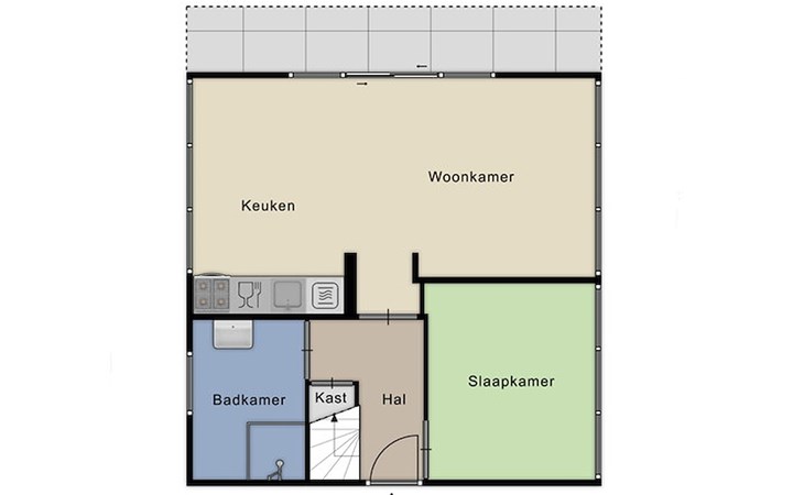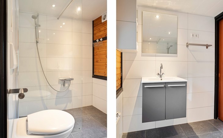 Op de begane grond bevindt zich 1 slaapkamer en 1 badkamer. In de slaapkamer staan 2 éénpersoonsbedden. De badkamer beschikt over vloerverwarming, een douche, wastafel en een toilet.
