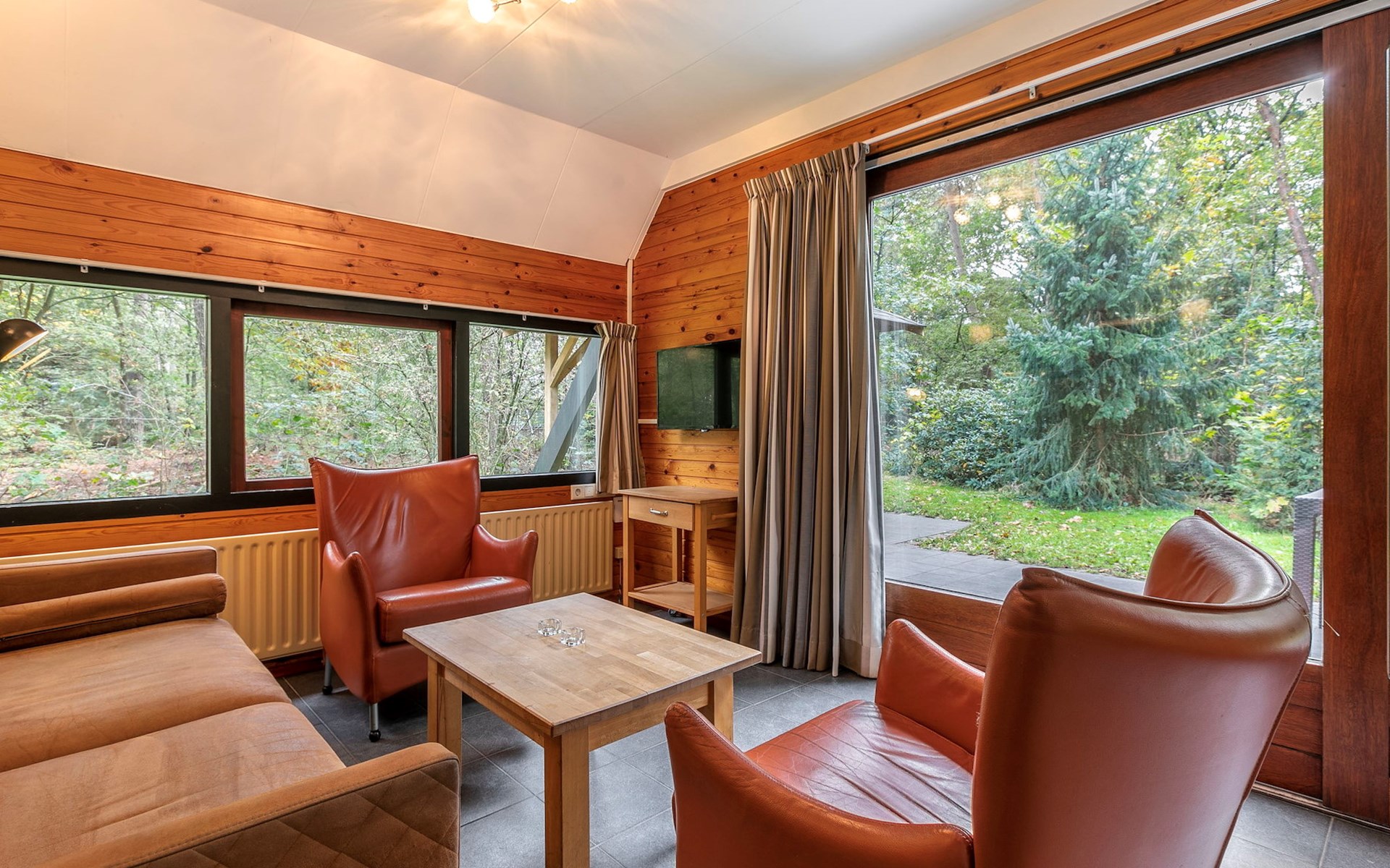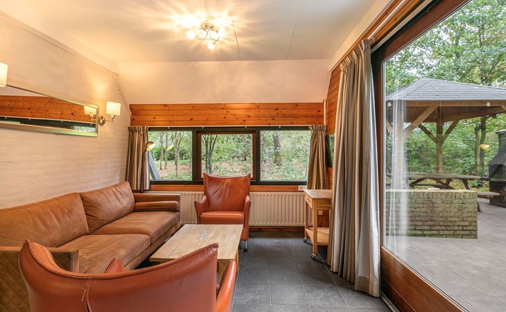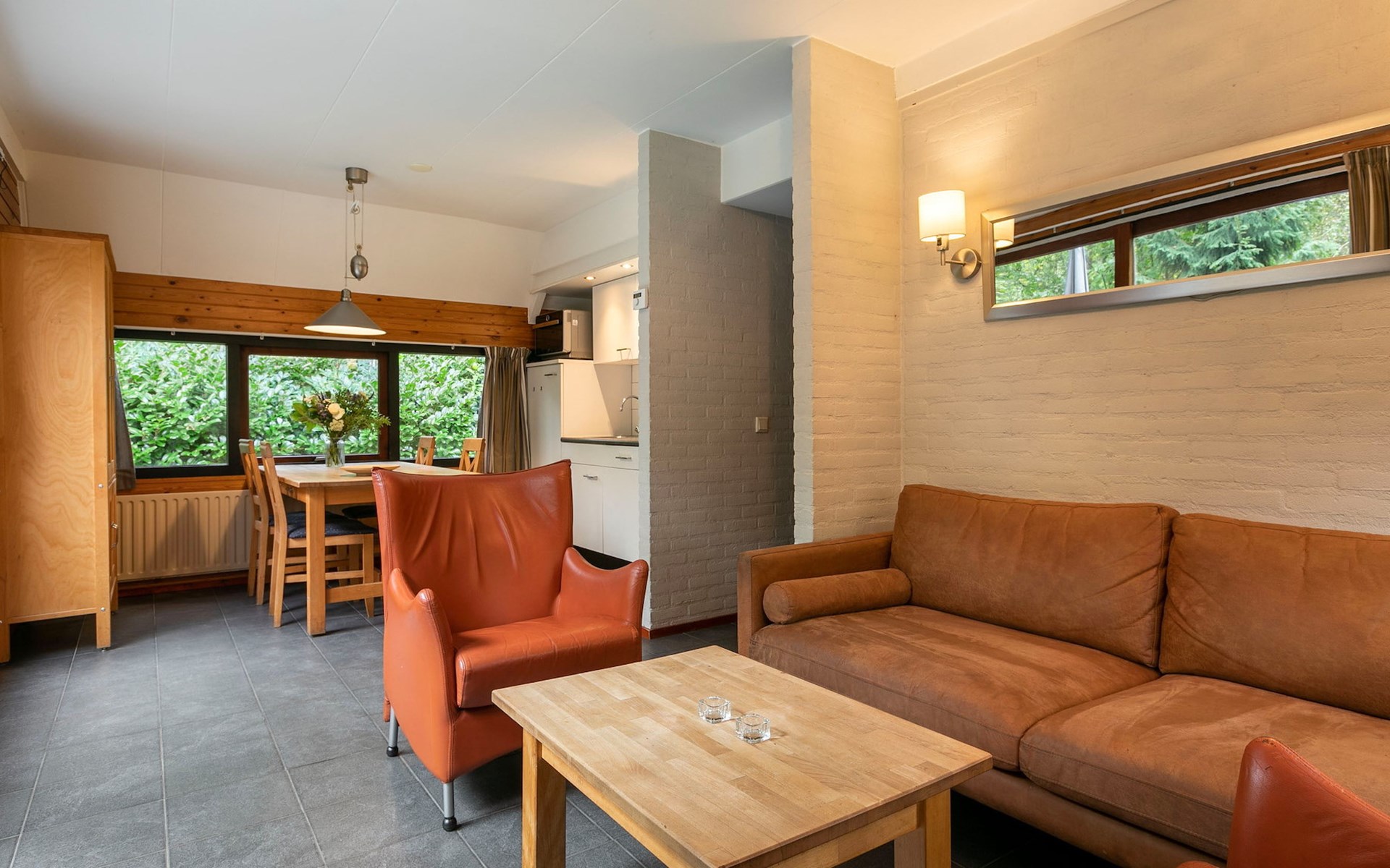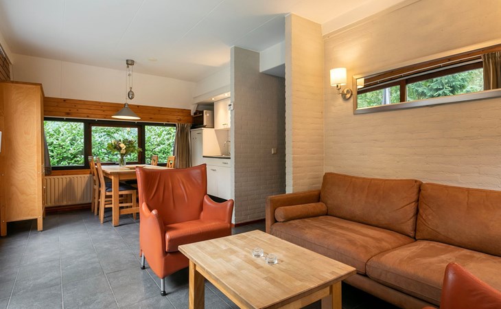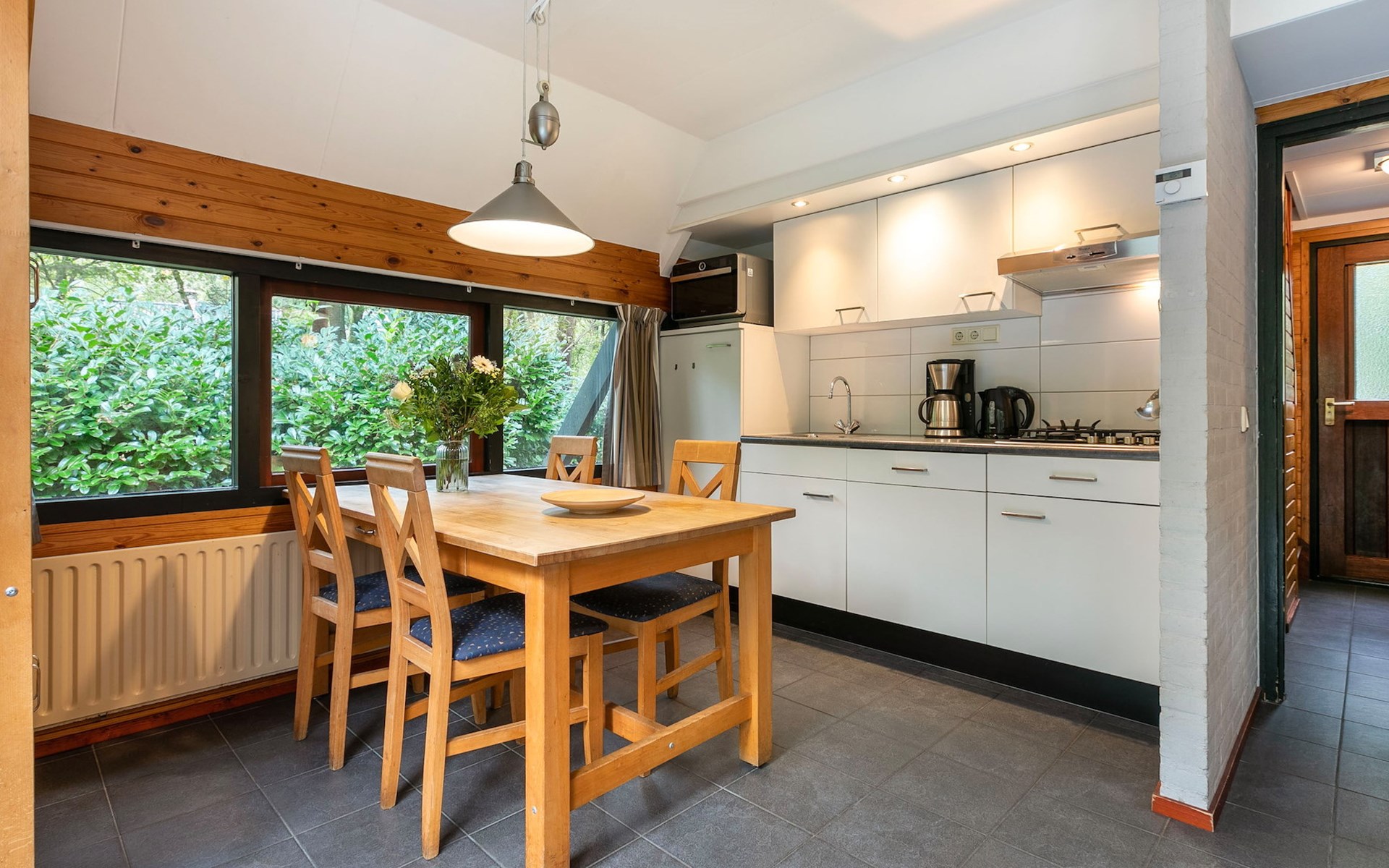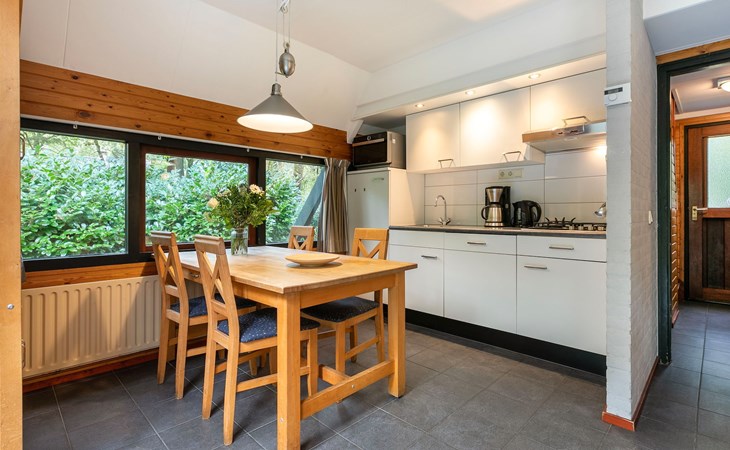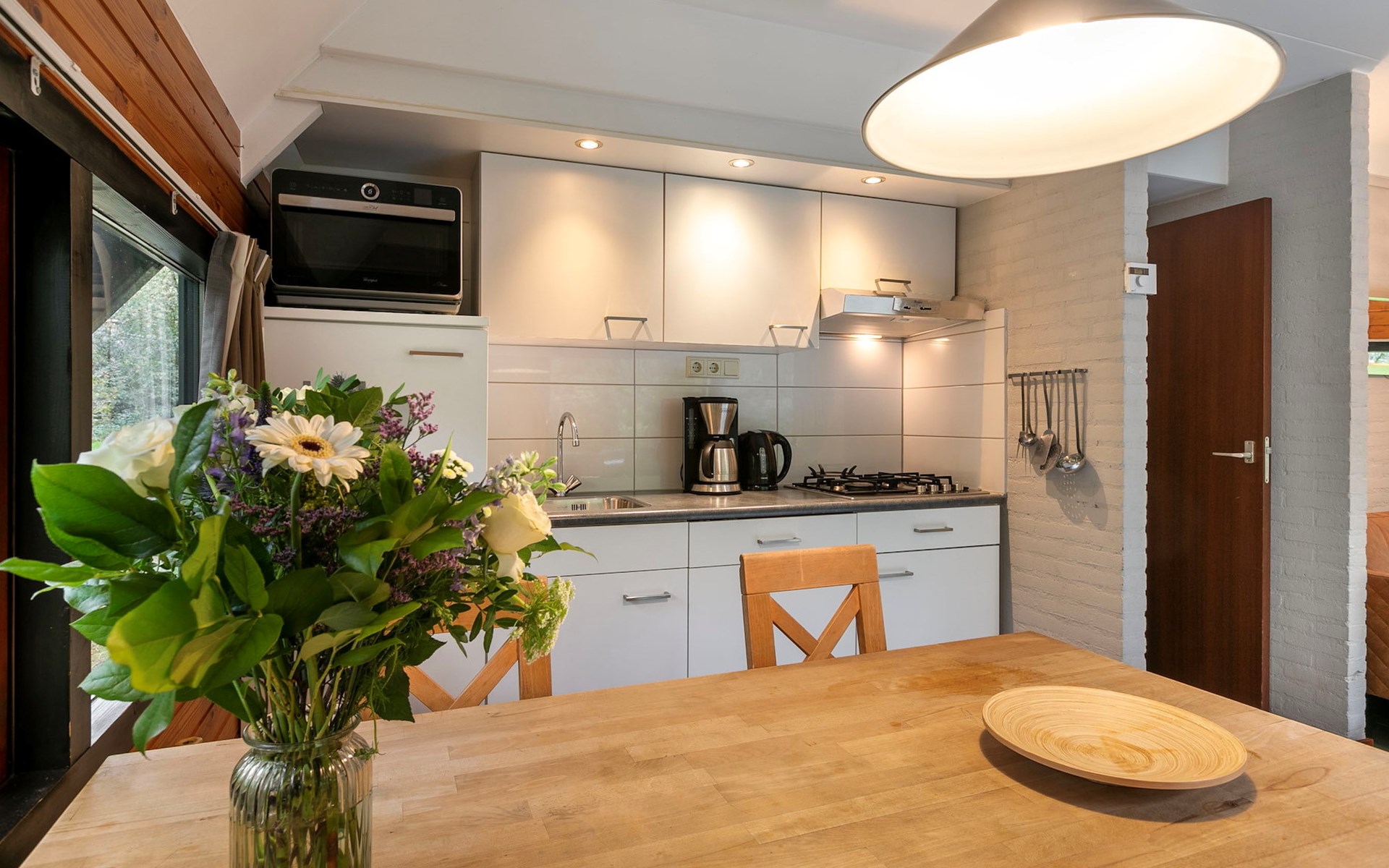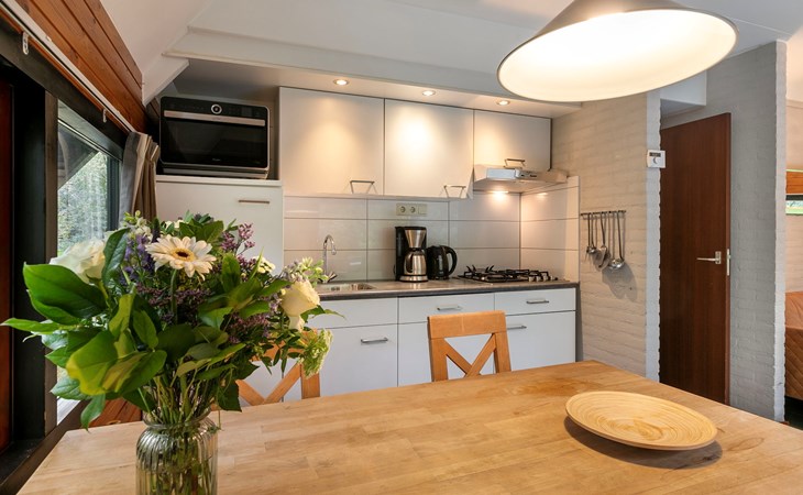 De woonkamer is voorzien van vloerverwarming en is ingericht met een zithoek en televisie. De bungalow heeft een keuken met een eethoek. De keuken is voorzien van onder andere een koelkast met vriesvak, filterkoffiezetapparaat, combimagnetron en een vaatwasser.