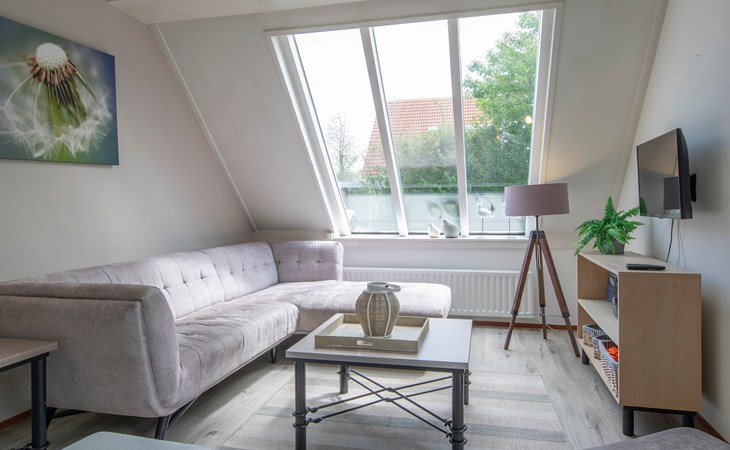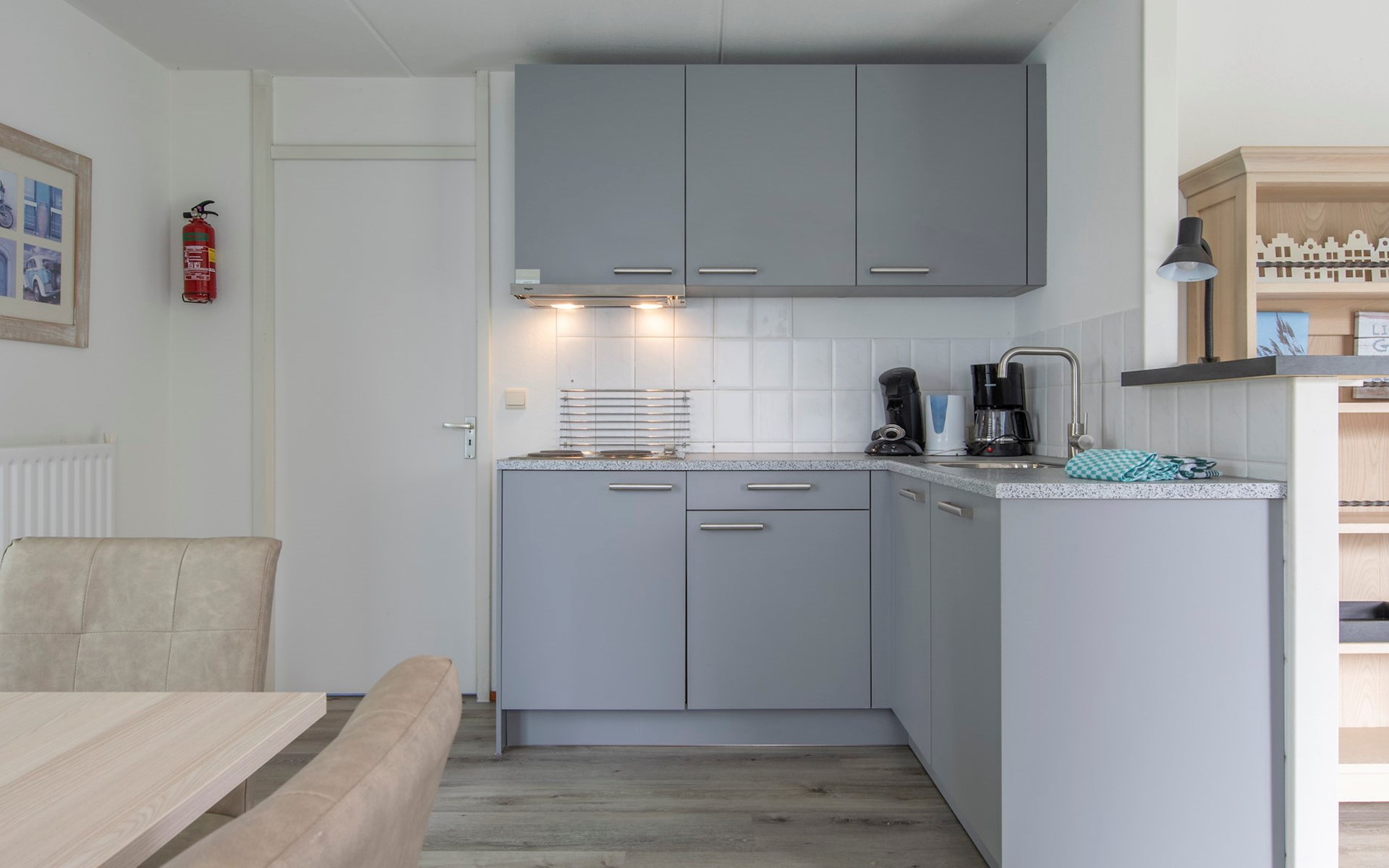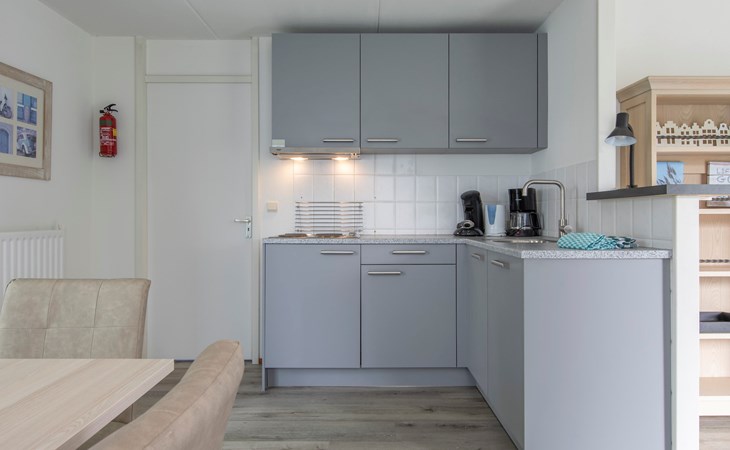 De woonkamer is ingericht met een zithoek en een televisie en grenst aan de open keuken met de eethoek. De keuken is voorzien van onder andere een koelkast, magnetron of combi magnetron, vaatwasser en een filterkoffiezetapparaat.