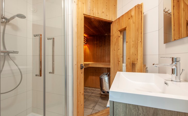 Daarnaast bevindt zich op de begane grond 1 slaapkamer met 2 éénpersoons boxsprings. De badkamer beschikt over een douchecabine, wastafel en een traditionele sauna. Ook is er een wasmachine en een apart toilet aanwezig.