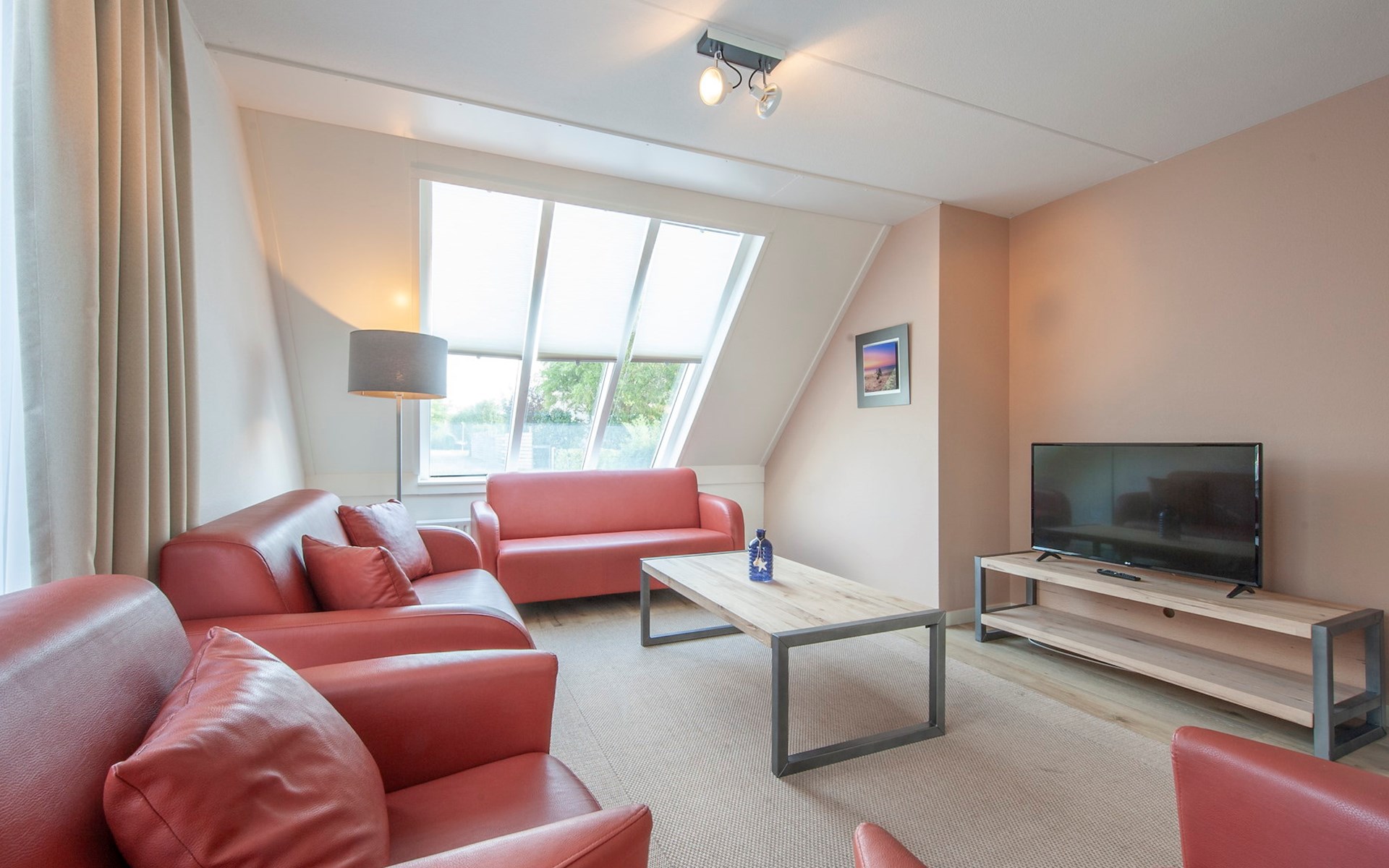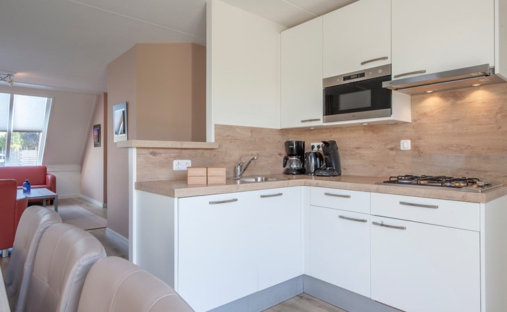 De woonkamer is ingericht met een zithoek en een televisie. Naast de woonkamer bevindt zich de open keuken met de eethoek. De keuken is voorzien van onder andere een combimagnetron, koelkast met vriesvak en een vaatwasser.
