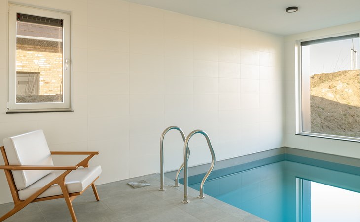 De woonkamer geeft je een doorkijkje naar het verwarmde binnenzwembad met de afmeting 4,70 x 3,55 meter. Bij het zwembad bevindt zich een zitje en een douche