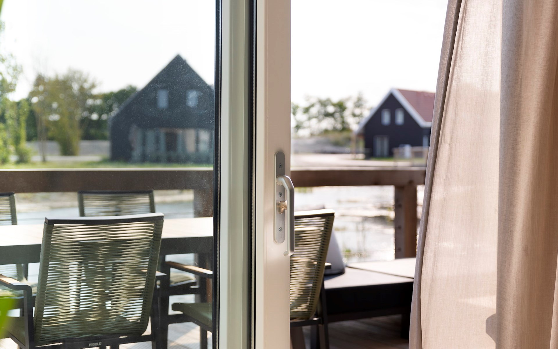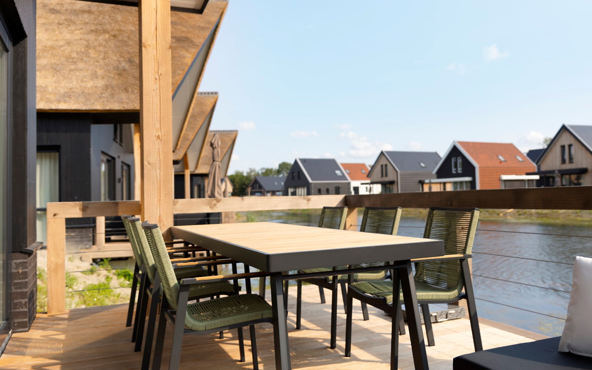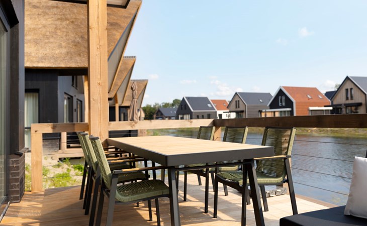 Via de openslaande deuren kom je uit op het terras met een loungeset en een eetset. Het terras bevindt zich boven de kreek en biedt je een mooi uitzicht op het water. De ideale plek om te tafelen of na te genieten van een heerlijk dagje uit.