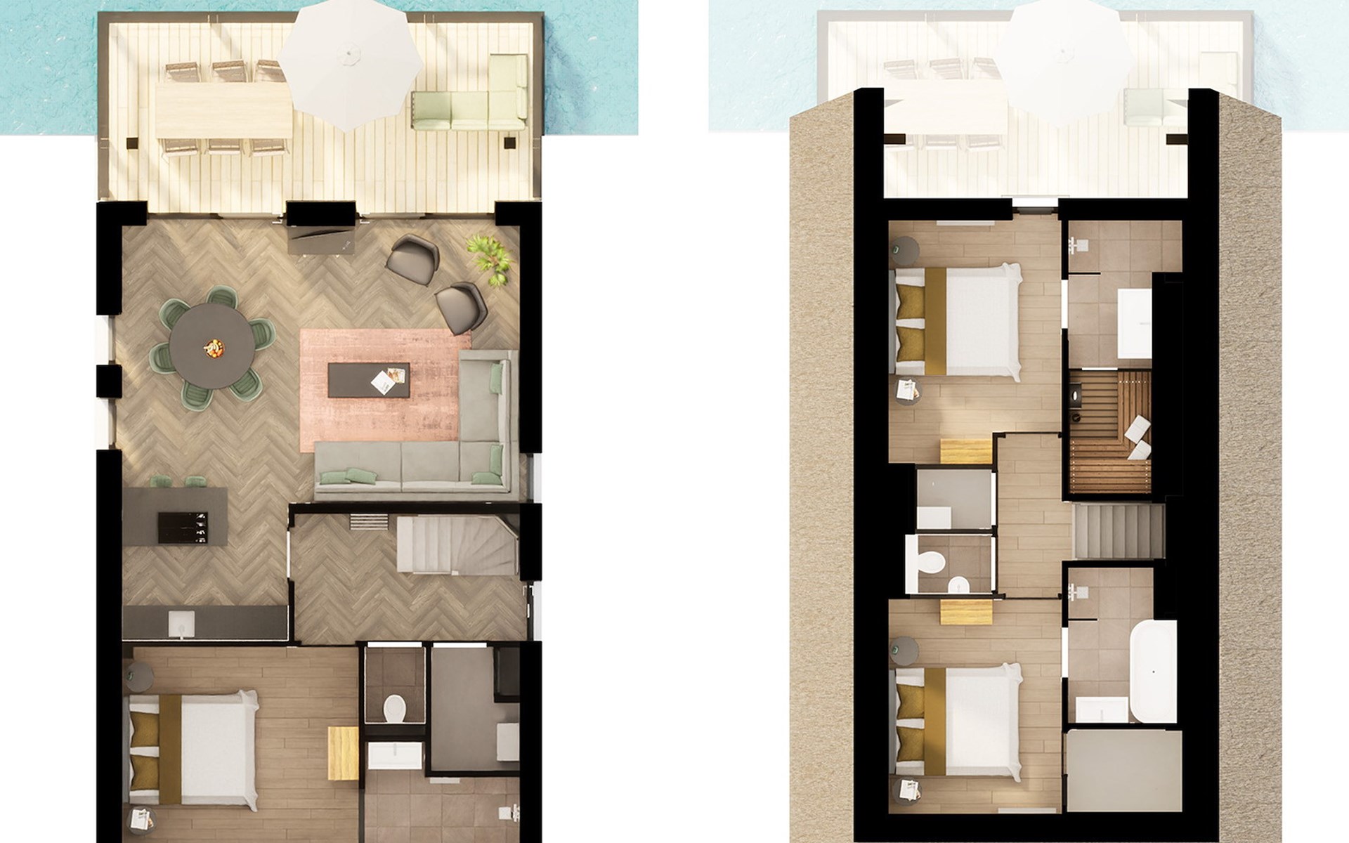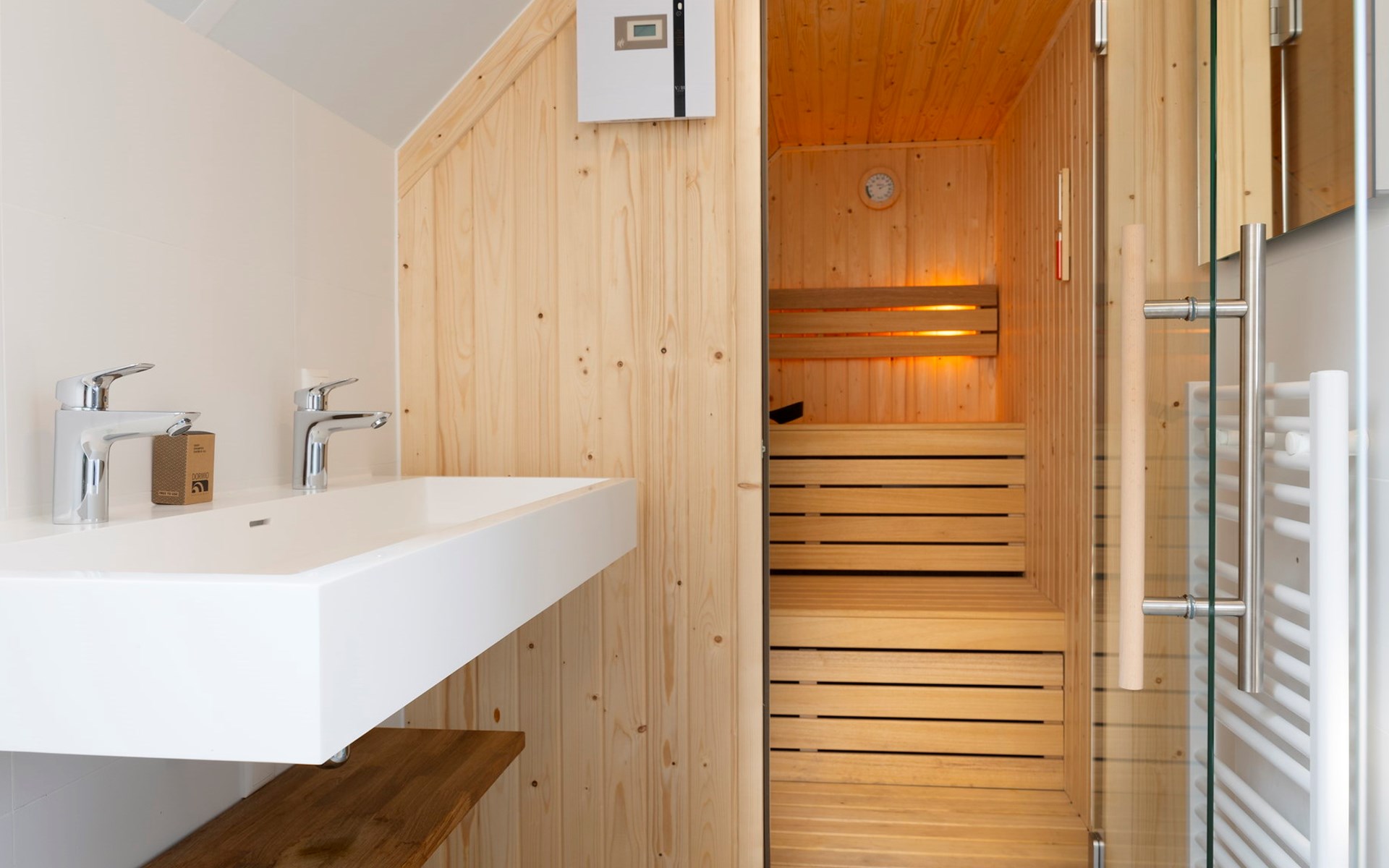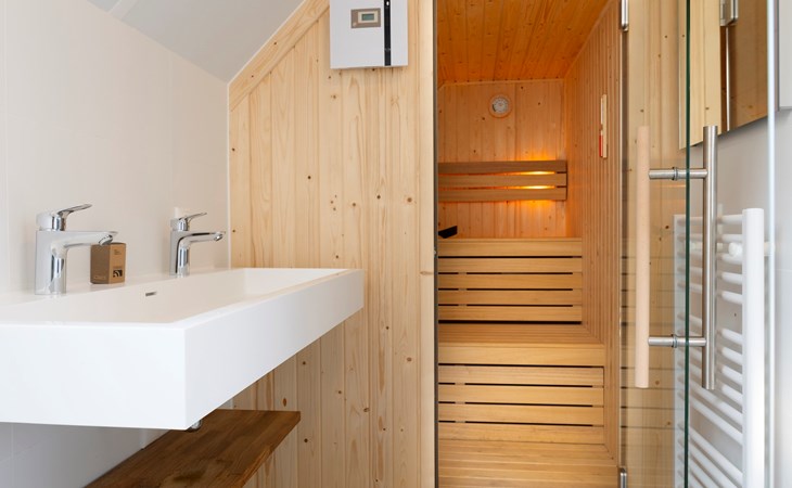 Op de eerste verdieping zijn er 2 slaapkamers met elk 2 éénpersoonsbedden. Beide slaapkamers hebben een en-suite badkamer, waarvan één met privé sauna, douche en wastafel. De andere en-suite badkamer beschikt over een ligbad, douche en een ruim wastafelmeubel. Daarnaast is er een separaat toilet aanwezig op de eerste verdieping.