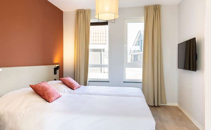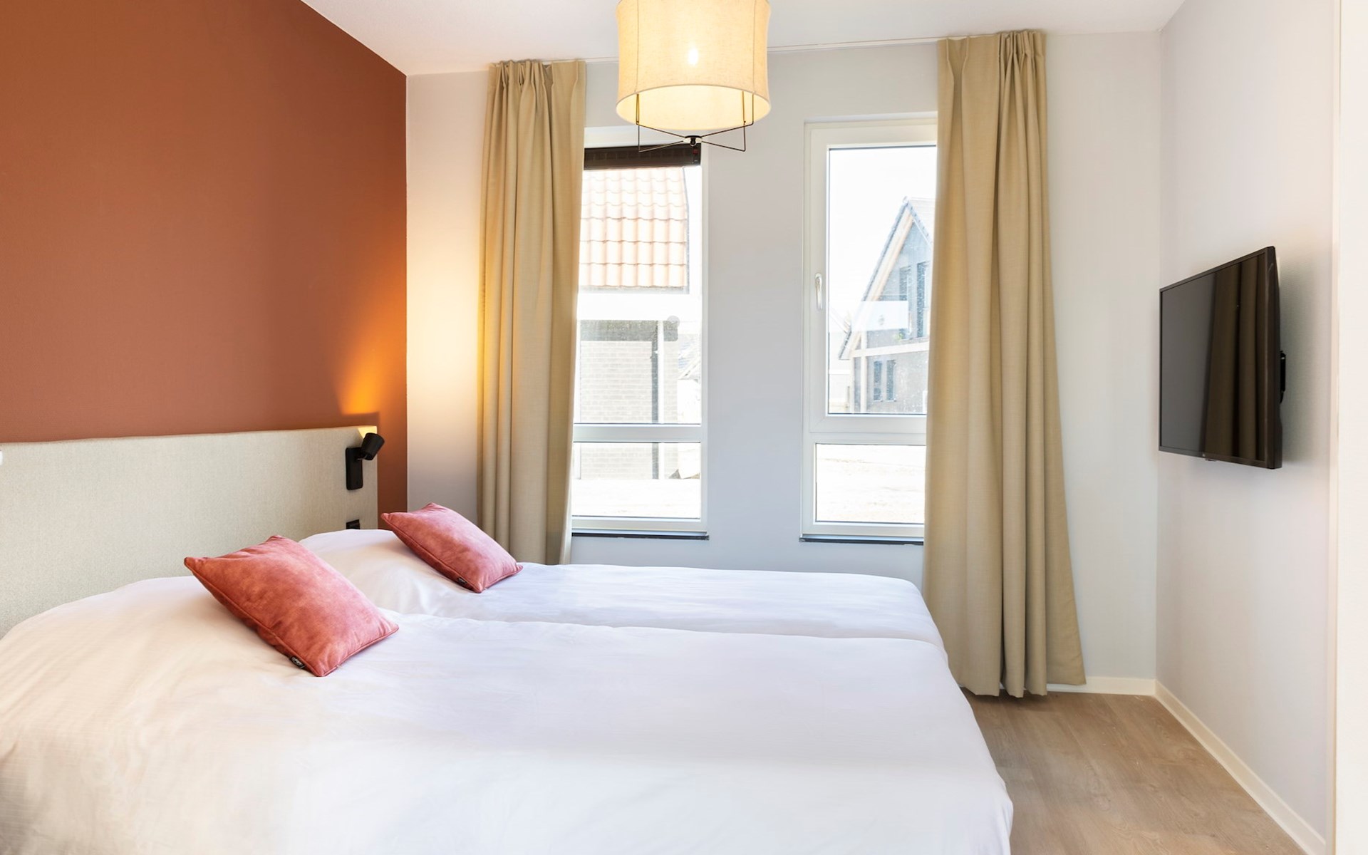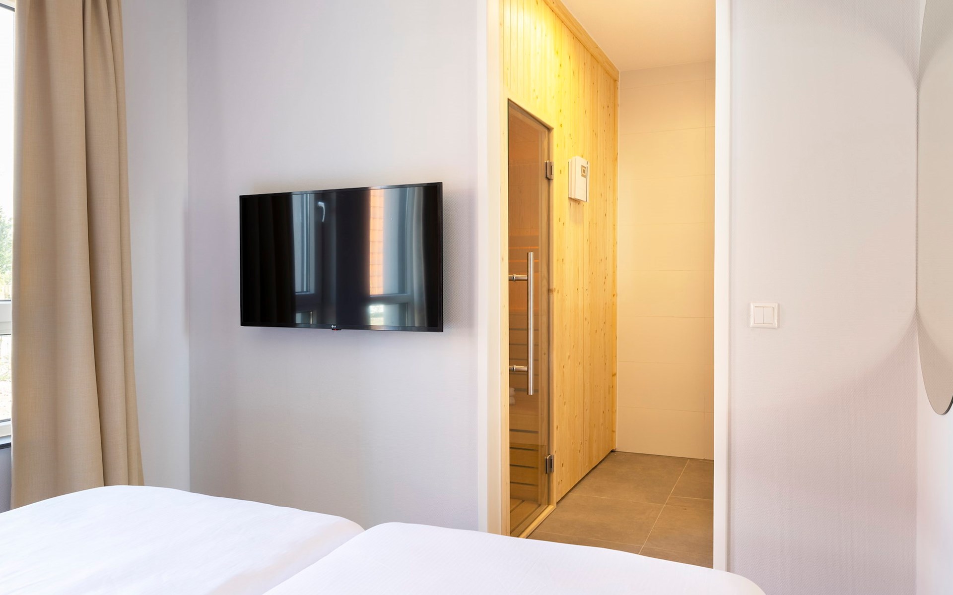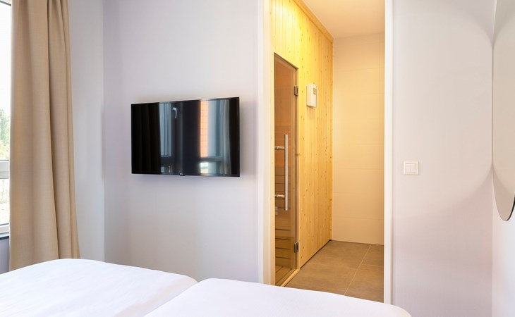 Verder bevindt zich op de begane grond een privé sauna in één van de badkamers waar je heerlijk kunt ontspannen. Ook zijn er 2 slaapkamers op de begane grond. Beide beschikken over 2 éénpersoonsbedden en een en-suite badkamer. Eén badkamer heeft een sauna, douche en wastafel. De andere badkamer is voorzien van een ligbad, douche en een wastafel. Bovendien is één slaapkamer voorzien van een smart-tv met streaming mogelijkheid. Daarnaast is er een separaat toilet aanwezig.