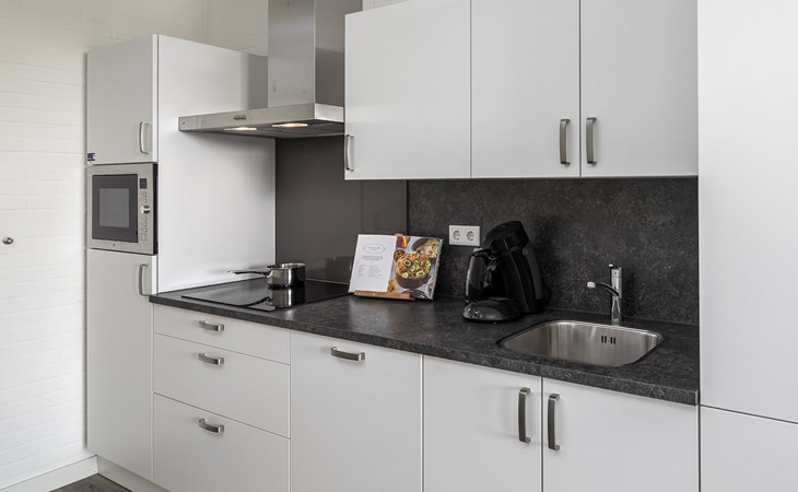 De woon-slaapkamer is ingericht met een zithoek, smart-tv en 2 éénpersoons boxsprings of een tweepersoons boxspring. De woon-slaapkamer grenst aan de open keuken met de eethoek. De keuken is voorzien van onder andere een koelkast met vriesvak, combimagnetron, vaatwasser en een Senseo apparaat. De badkamer beschikt over een inloopdouche, wastafel en toilet.