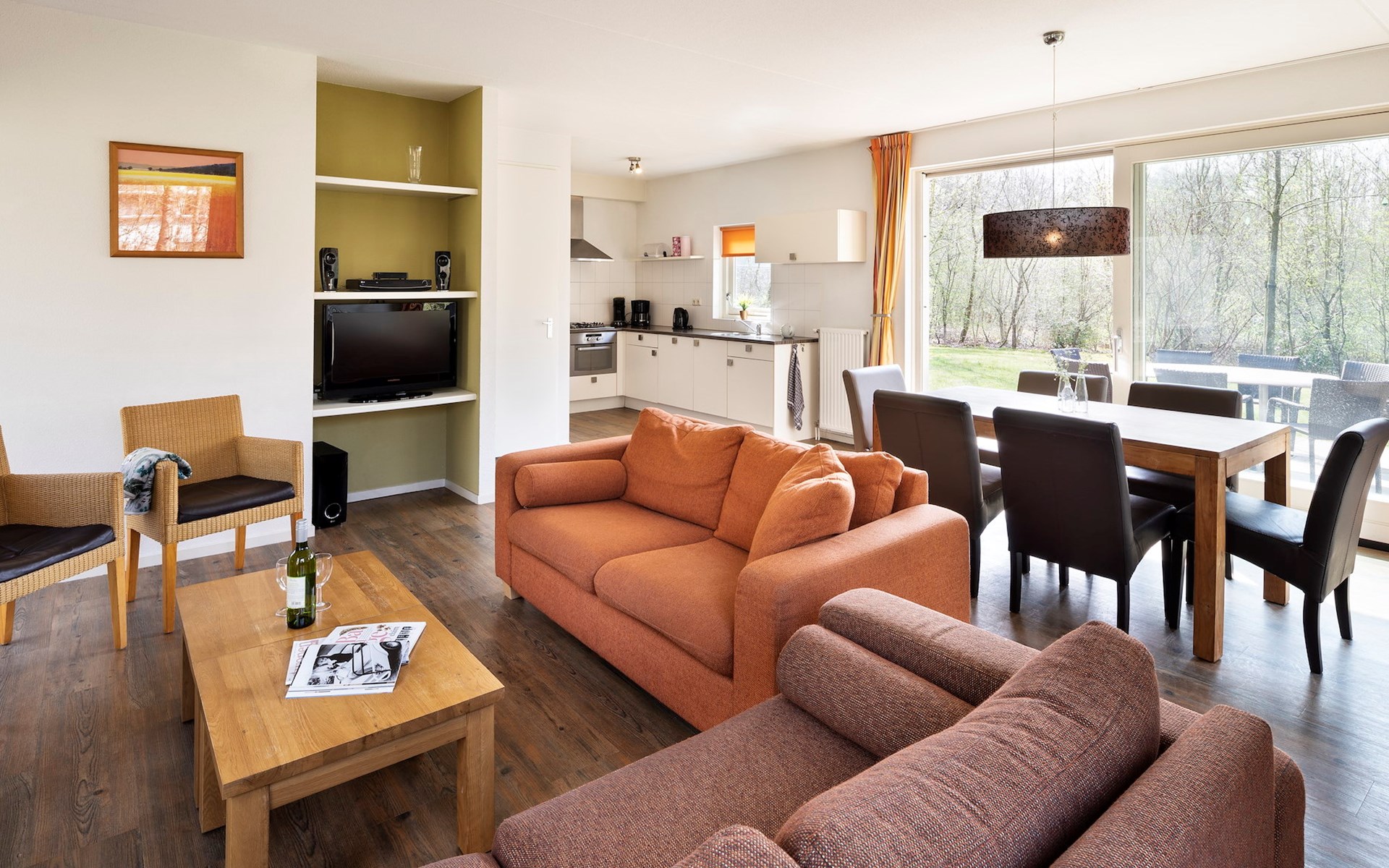 De woonkamer is ingericht met een zithoek, televisie met dvd-speler en een sfeerhaard. De villa heeft een brede schuifpui naar het terras en een open keuken met een eethoek. De keuken is voorzien van onder andere een koel-vriescombinatie, Senseo apparaat, filterkoffiezetapparaat, combimagnetron en een vaatwasser.