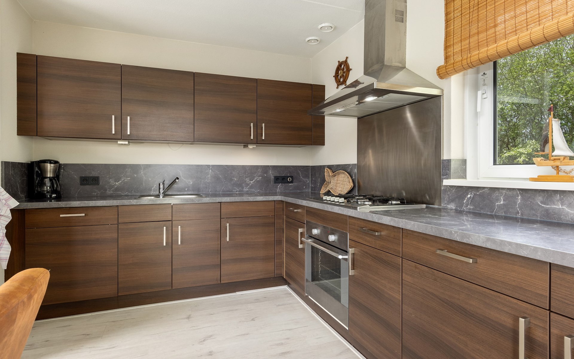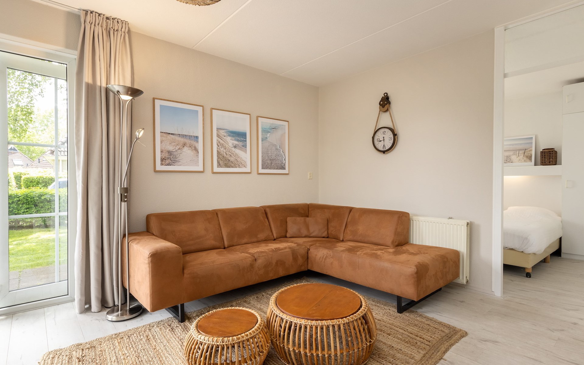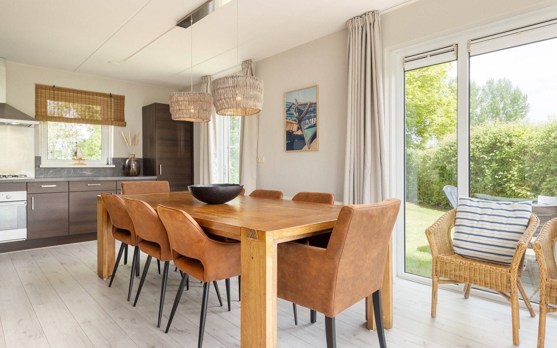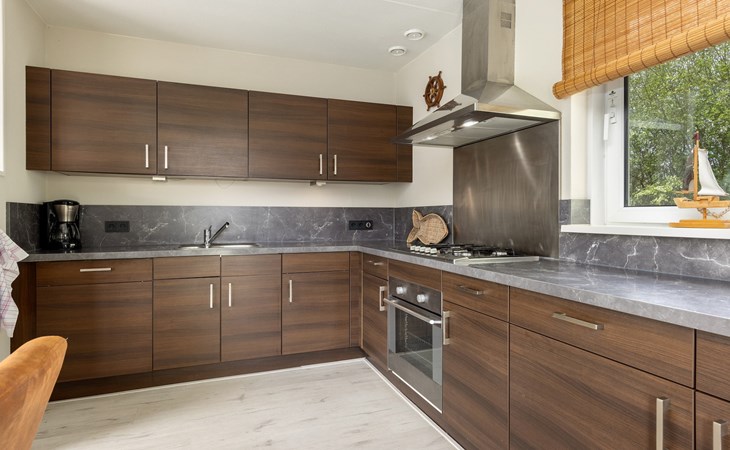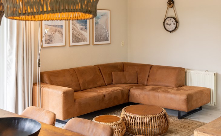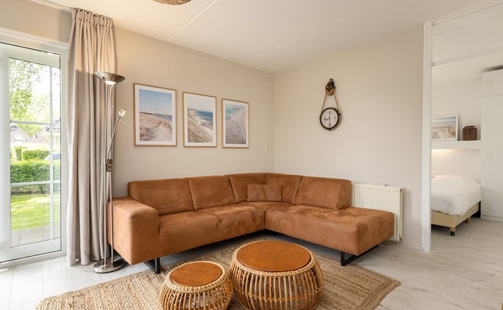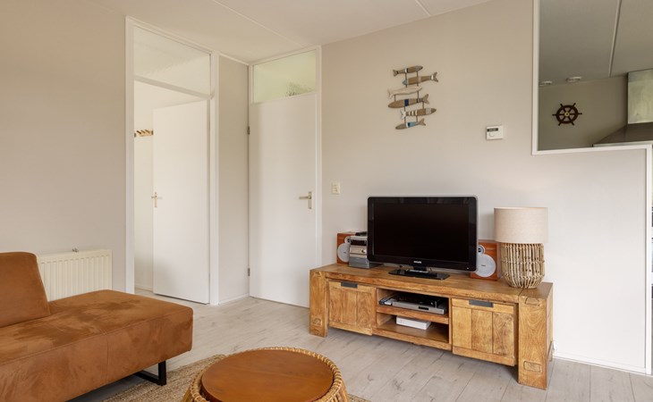 De woonkamer is ingericht met een zithoek en televisie en grenst aan de open keuken met de eethoek. De open keuken is voorzien van onder andere een koelkast met vriesvak, combimagnetron, filterkoffiezetapparaat en een vaatwasser.